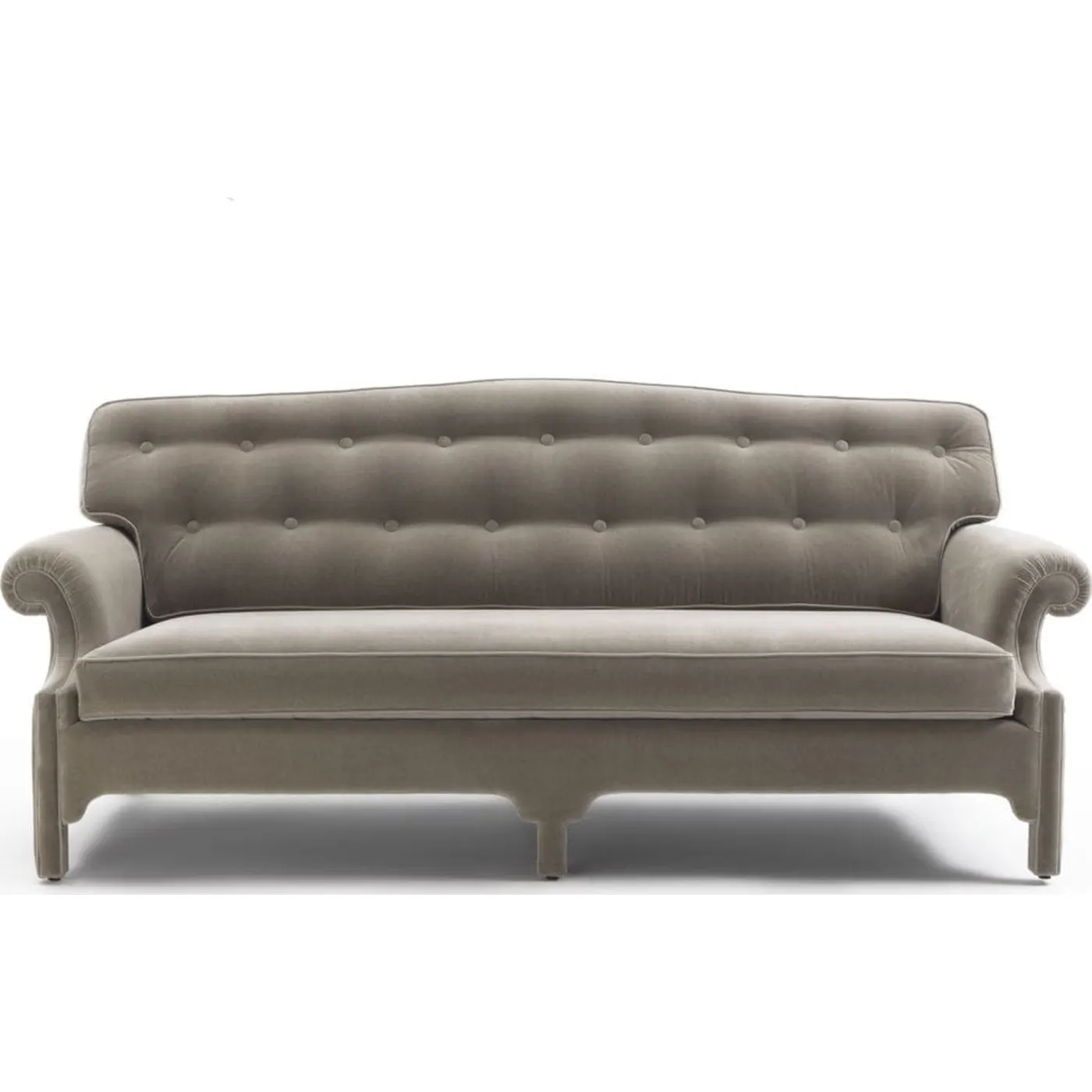 The Hollywood sofa in velvet features a simple, straight line framework, luxurious tufted upholstery covering the set and interior back and sides. This beautiful sofa succeeds in adding swank and modern hollywood glamour to your living room.
