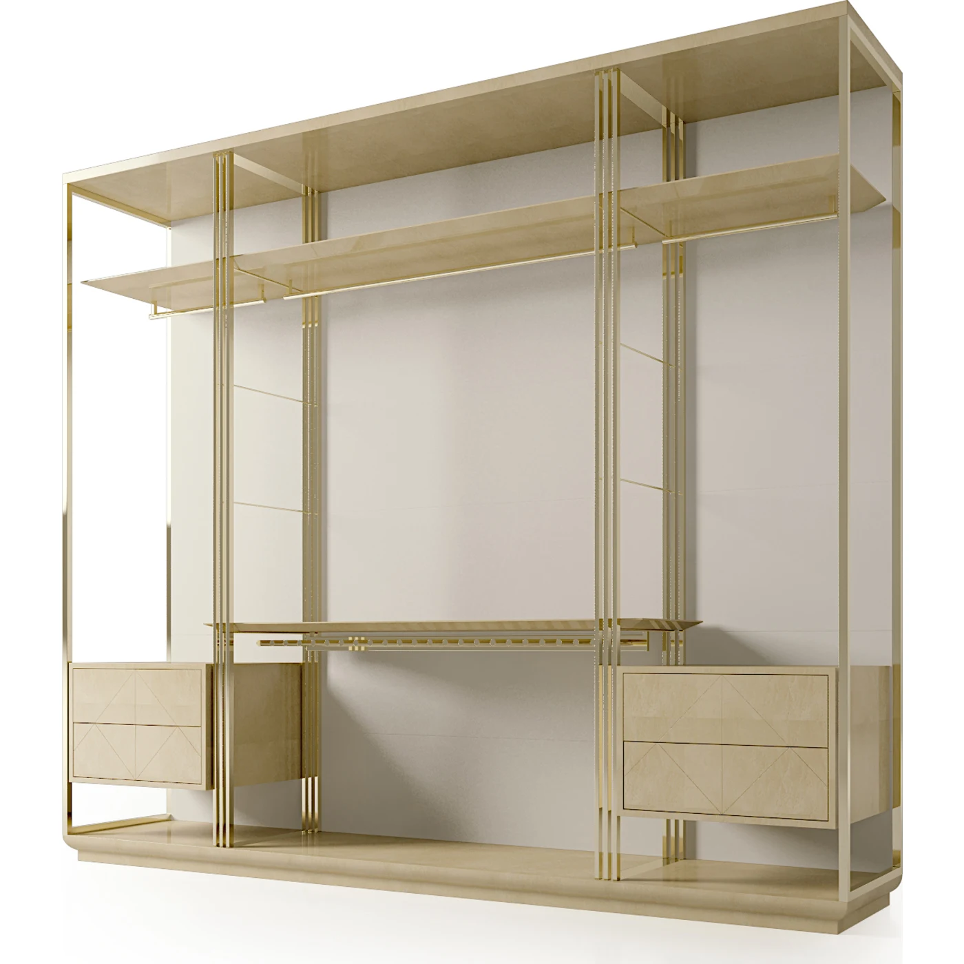 This stunning wardrobe is both practical and beautiful. This wardrobe comes in beige with golden details that are a statement piece in any bedroom. The design is clean, sleek, and minimalist. The dresser comes with a mirror and four drawers and multiple shelves for enough space with a lot of storage space. With enough room for both shoes and clothes, this unit is the perfect way to organize your room.