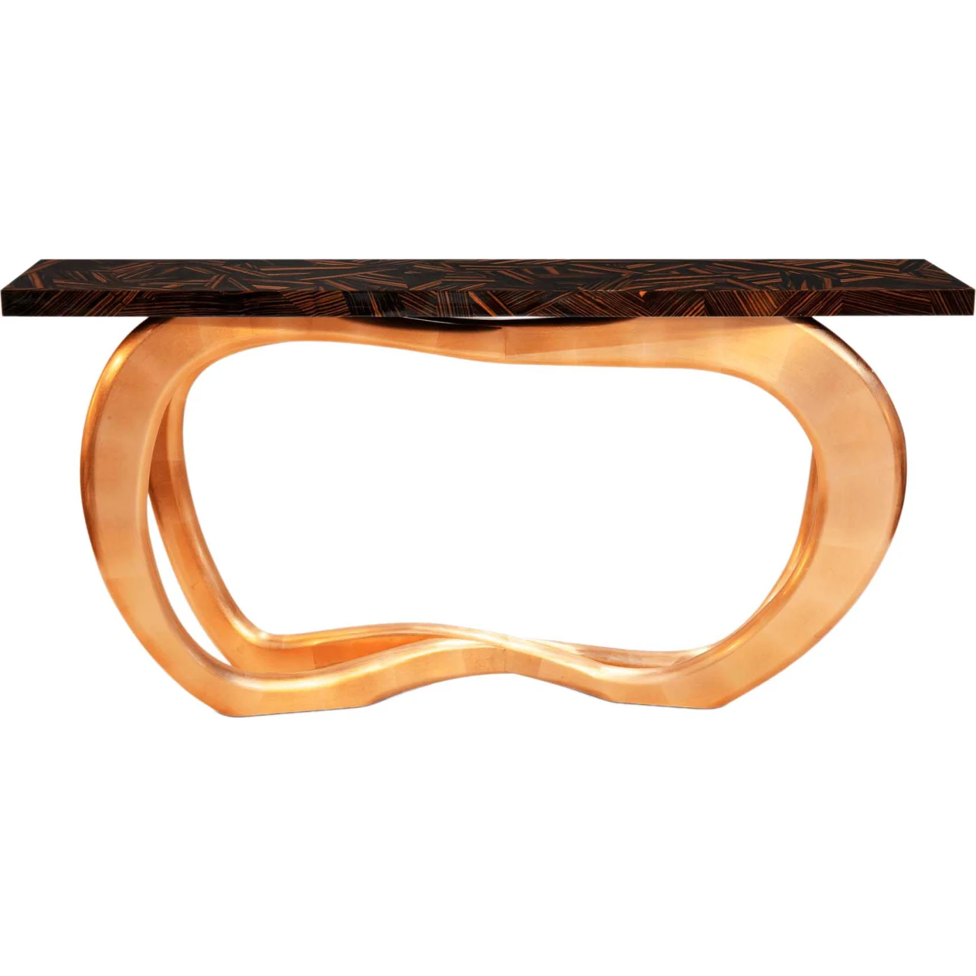 The Infinity console is a fascinating and unique piece that has been shown to be amazing and eye-catching by its sinuous and beautiful lines. Boca do Lobo's furniture exudes style, grace, and luxury. Infinity adds a sophisticated touch to every living space with its glistening radiance. This incredible item, which features a striking geometric mosaic wood veneer top and a copper leaf base finished with high gloss varnish, looks stunning in both modern and classic entry halls and is a perfect complement to any living room decorating.