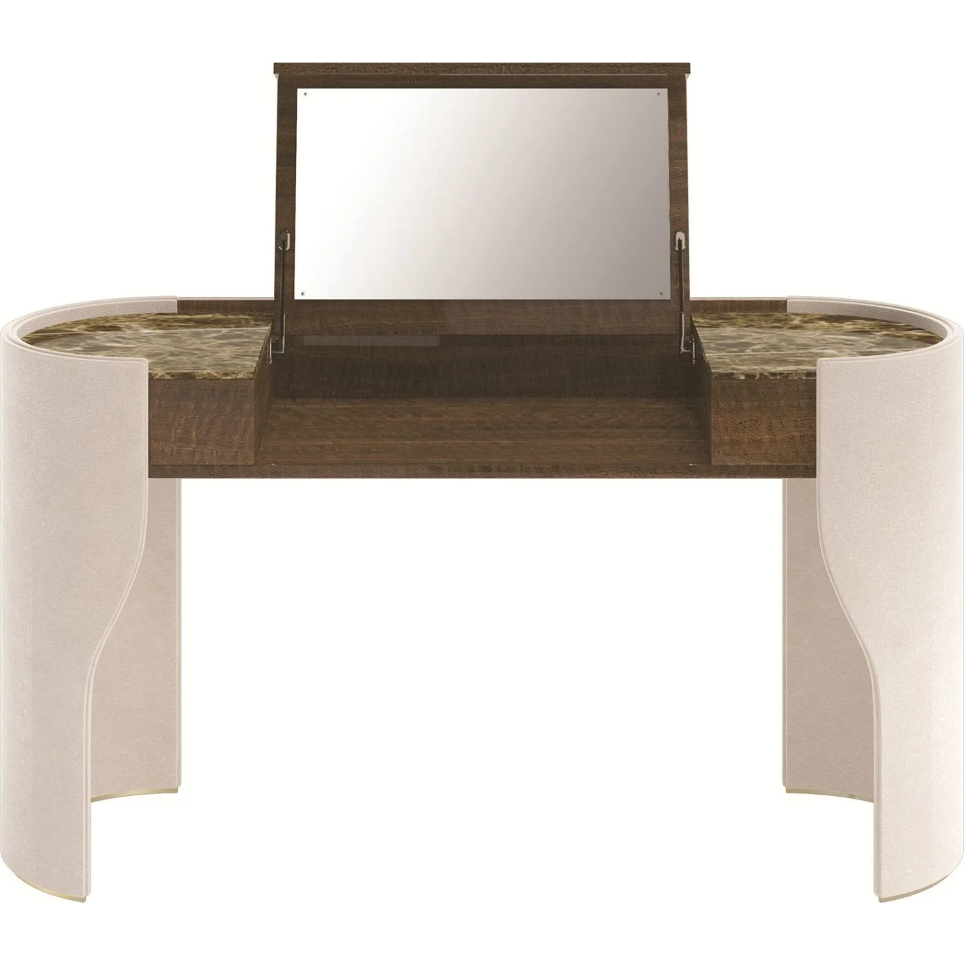 Jubilee is a wooden console designed with a wood structure and a mirror flap for added functionality and style. Its sides are elegantly adorned with leather, enhancing its overall aesthetic appeal.