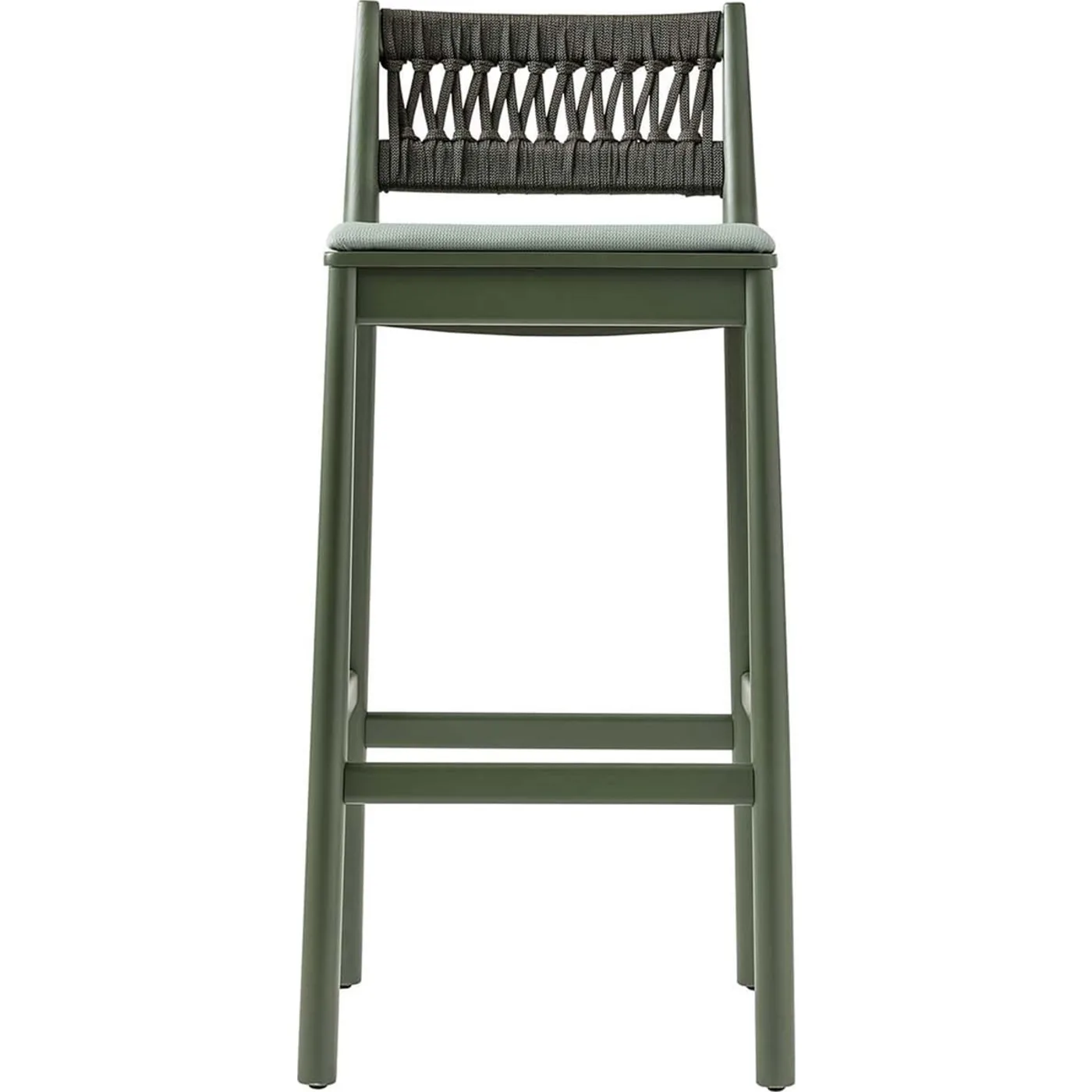 Adding vibrancy to modern, rustic-chic interiors in both private and contract settings, this stool by Emilio Nanni captivates with its bold green hue and distinctive design. Offering a contemporary reinterpretation of the classic chair archetype, it is meticulously handcrafted from wood, with a fabric upholstered seat for comfort. The refined backrest is adorned with a striking rope motif, further enhancing its unique appeal. For personalized touches and customizations, please consult the Concierge.