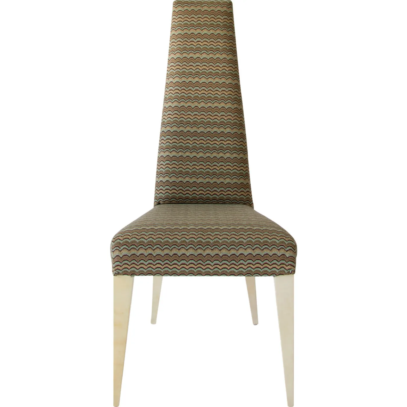 The Kajal Dining Chair is a stunning blend of sleek lines and distinctive design elements. Its sturdy tapered legs are enveloped in natural light-toned parchment, adding a touch of sophistication and elegance. Upholstered in a multicolor fabric with a subtle pattern in neutral tones, this chair effortlessly complements the decor of contemporary-style dining rooms, enhancing their aesthetic appeal with its unique and stylish presence.