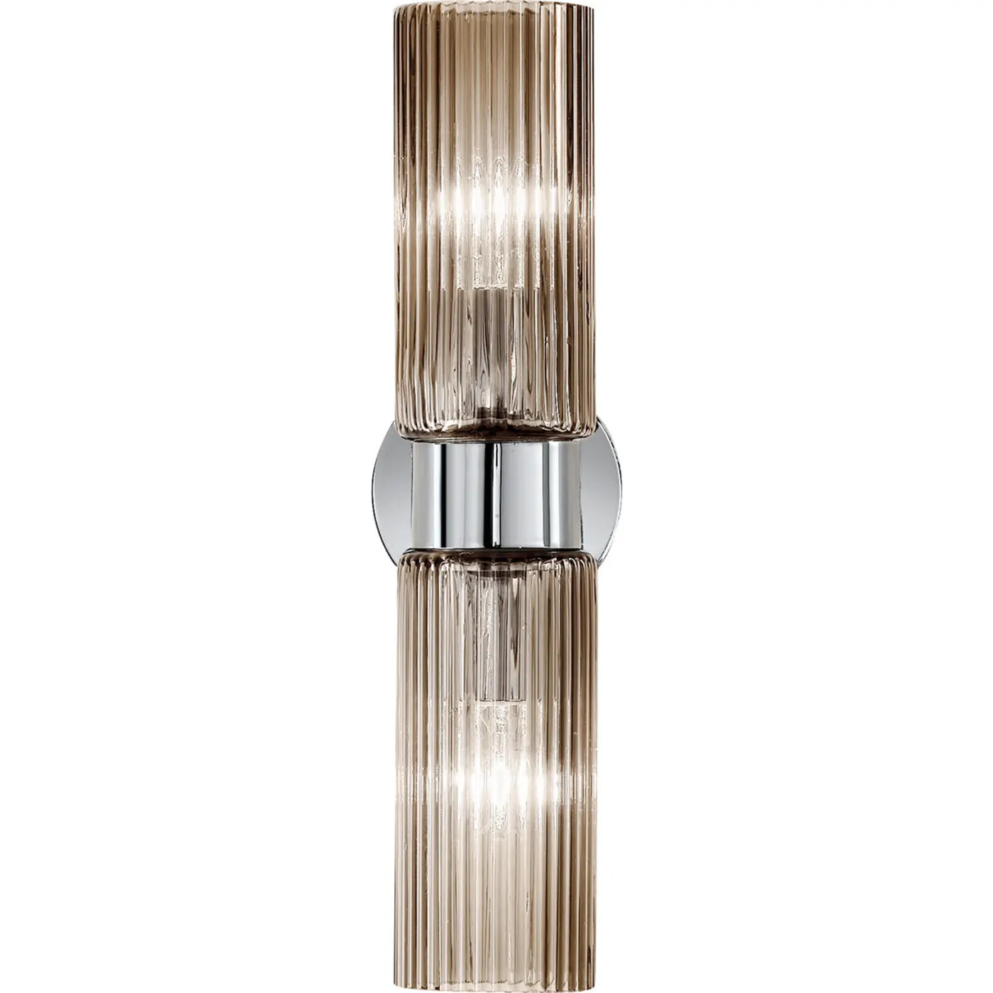 This elegant sconce embodies modern design with its transparent elements and sleek lines. It features a titanium frame for secure wall mounting, accented by two ridged shades crafted from smoky artistic glass. Designed to accommodate two 10W LED bulbs, each radiating light in opposite directions for even illumination. For details on available finishing options, please contact our Concierge.