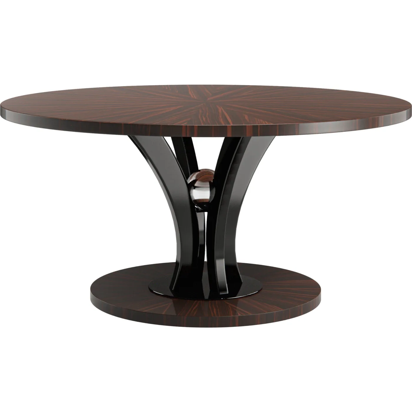 Korp features a round table design with a wood top adorned with sleek metal details, combining natural warmth with modern sophistication. Its legs are finished in black lacquer, adding a bold and contemporary accent to its overall aesthetic.