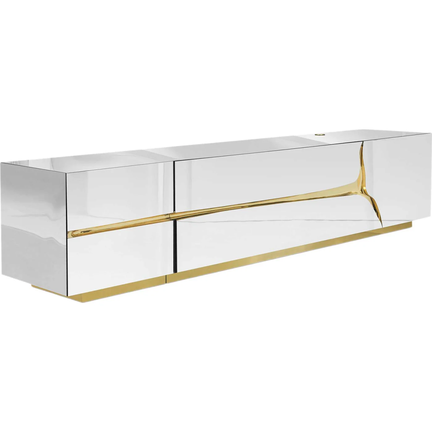 The Lapiaz TV cabinet elevates superb design and craftsmanship to a new level. Inspired by real karst formations formed by the surface disintegration, freezing, or thawing of limestone or dolomite rocks, this modern design item finds beauty in the most unlikely places. Its natural appearance is produced by hand-fitting polished brass and a flawlessly mirror-like polished stainless steel surface. It is made up of two modules that open to reveal a unique black interior with glass shelves and drawers of various shapes. A stunning contrast between force and delicacy is conveyed by the mirrored façade and the hammered gold embellishments, giving interior design a fresh, modern feel. A functional artwork piece born from cold and freshly cracked to show off the world rich, golden details.