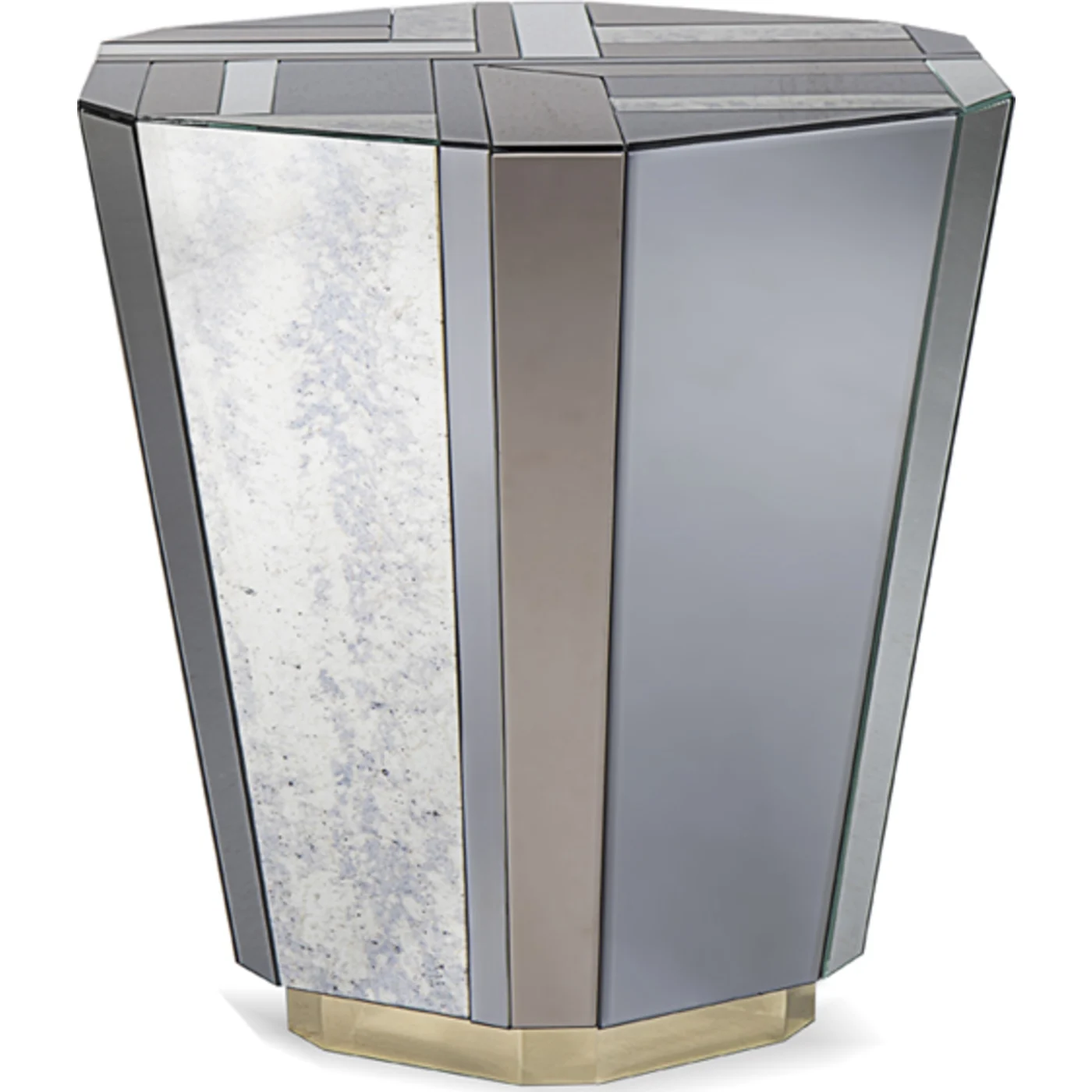 This table is ideal for small spaces. It's great for holding magazines, candles, and anything else that needs to be placed on a surface. The glass surface is durable and won't crack or break easily. The delicate side table is made of smoked mirrors and multi-coloured glasses offering an industrial feel with a modern flair. With a round top and square satin brass legs, the table is ideal for smaller spaces.
