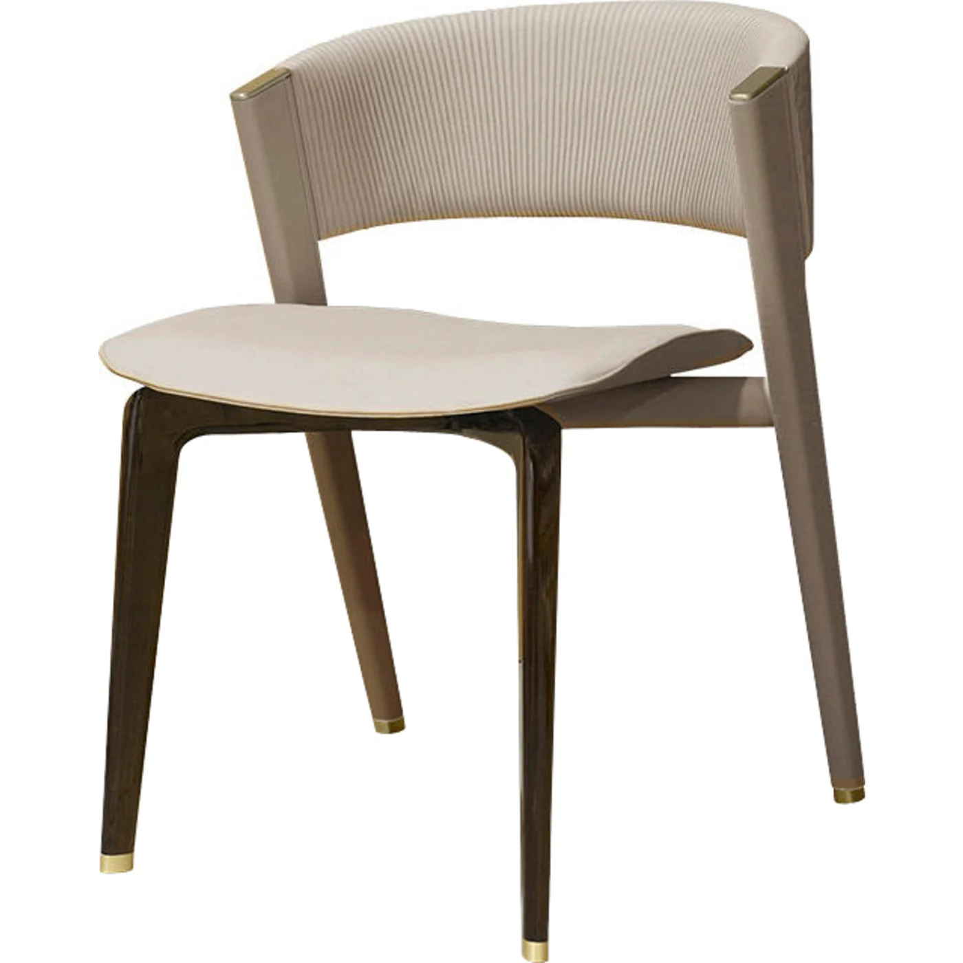 The Lisbona chair is distinguished by its sophisticated appearance, meticulously designed for optimal comfort. Its proportions are carefully crafted to ensure the utmost comfort. The front legs are crafted from maple wood, lacquered in a dark brown hue, contrasting elegantly with the upholstered leather frame and back legs. Delicate brushed metal accents adorn the upper part of the chair. The slightly reclined back legs support a leather backrest, which is enveloping and embellished with a "plissè" effect. The leather seat highlights the chair's form, featuring a cross detail that connects the legs seamlessly.