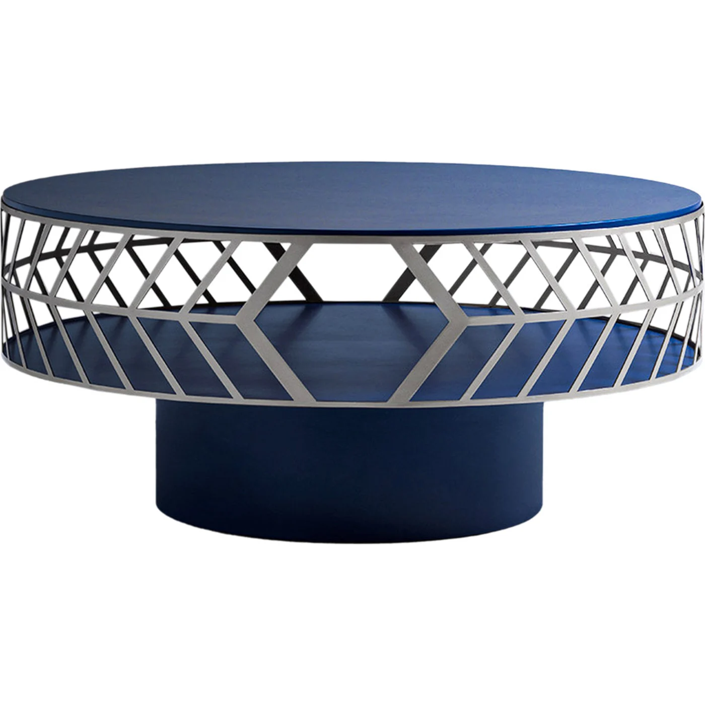 This sculptured coffee table was intended to be the main attraction in a plain contemporary living space. A stunning herringbone-style openwork structure made of champagne-finished metal contours the spacious storage compartment, which is sealed by two disks and a structural column on its MDF frame painted in a deep shade of matte blue. Change in color is available on request. Kindly contact the Concierge for more details.