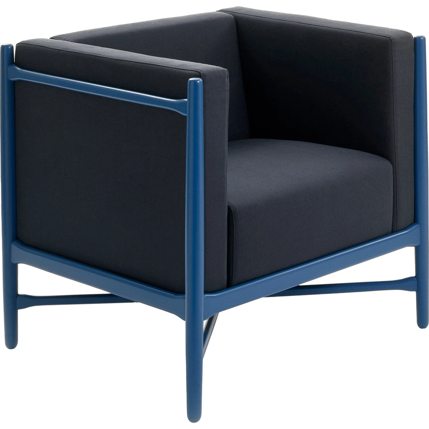 This armchair designed by Lorenz+Kaz features a solid natural beech frame with a matte Klein blue lacquer finish. The cushions are padded with differentiated density polyurethane foam for optimal comfort and are covered in Orion Blue wool fabric Topia, which is removable for easy cleaning. The design reflects the elegant and harmonious style of Lorenz+Kaz, with a strong influence from Bauhaus and Nordic design, blended with a unique "South effect" that is expressed through the use of vibrant colors and materials.