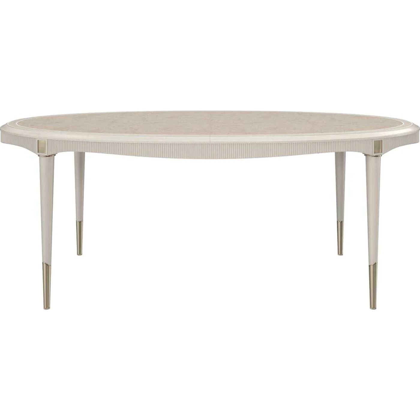 Extending the beloved Love bedroom collection into the dining room, this table exudes elegance and charm. Its apron features gentle flowing curves adorned with applied reeding on the face, accentuated by corner blocks atop tapered round legs. Each leg is capped with a Whisper of Gold ferrule, echoing the graceful lines of the apron. The Lovely Burl finish on the top, crafted from pieced burl maple veneer, is complemented by a cream pinstripe silkscreen banding, harmonizing with the Matte Pearl frame and legs. With three 56cm leaves included, the table comfortably seats 12 when fully extended.