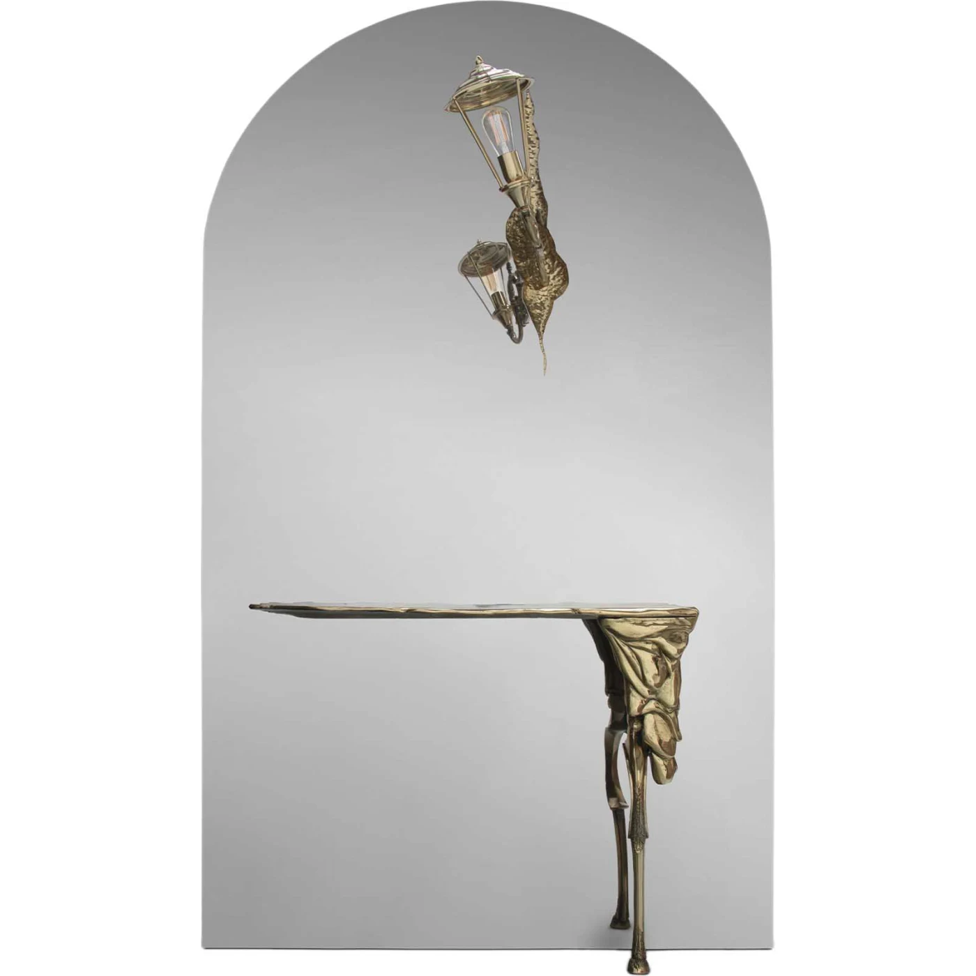 Lumière Console is a masterwork that brings the mystique of the boulevards of the late 19th century into your home. The Lumiere, a harmonious combination of Victorian street lights and architectural lines, is a prime example of the modern duality of beauty and utility. The sculpture set consists of a large wall mirror, a golden lamp, and a practical console that makes up one streamlined arched frame in wood adorned with polished stainless-steel. The lamp is a beautiful pane lantern that was hand-drawn by a ceramic casting using a mold. The lamp rests on an original architectural accessory, the base of which incorporates an antique accent of uneven edges, and is created by hand-fitting gold-hammered sheets of brass. A distinctive console composed of cast brass emerges in the lower portion to provide this piece of art additional functionality. Originating from the long history of iron forging and expert goldsmithing, this magnificent mirror lamp console installation is a heartfelt work with timeless colors for magnificent private homes or excellent commercial spaces. An innovative collectible design for a classic and luxurious look in the modern day.