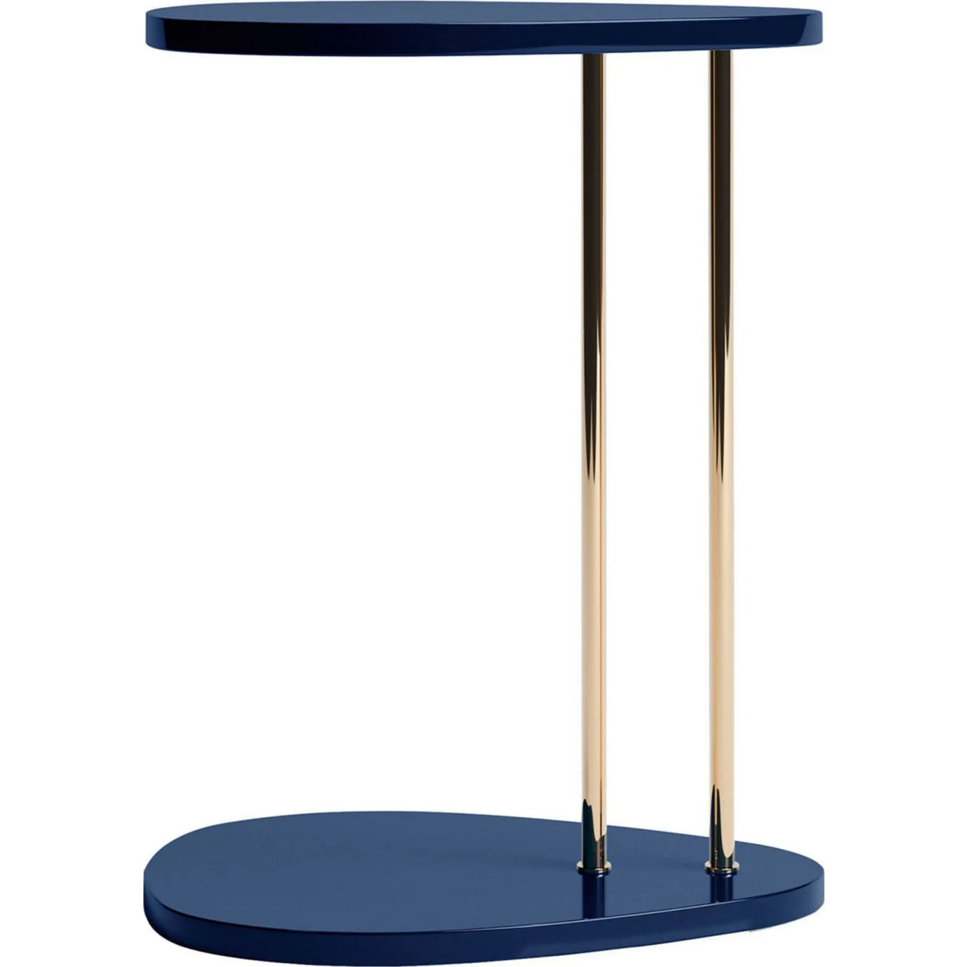The Marlene Side Table features a captivating cantilever design with an identical drop-shaped lacquered plywood top and base connected by two chrome-plated brass cylindrical bars. Ideal for a modern office lounge or living room, the vibrant cobalt blue and chrome accents provide a stylish finishing touch to any sleek and chic interior.