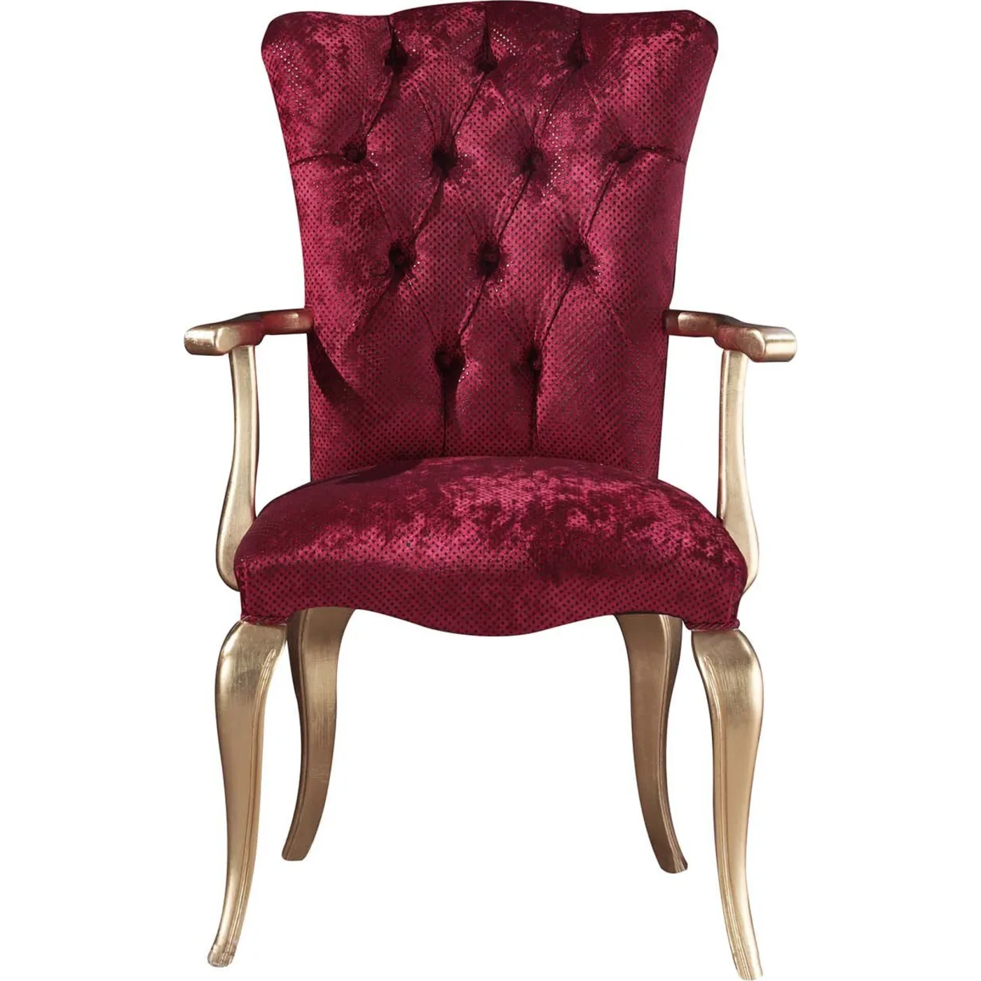 Created by skilled artisans in Veneto, the Metropol Armchair adds a touch of luxury and elegance to classic living rooms or lounges. Its graceful legs, covered in gold leaf, along with matching armrests, radiate sophistication. The chair is enveloped in rich red velvet, providing a truly extravagant experience. The addition of detailed capitonnè stitching enhances its overall appeal, making it a perfect choice for comfort and style.