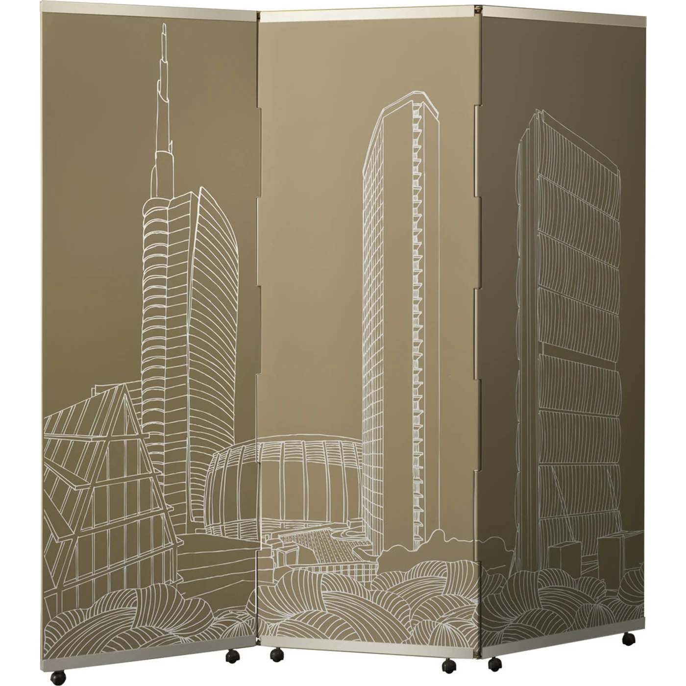 From the esteemed Oltre il Paesaggio collection, this captivating screen showcases printed drawings by Anna Sutor, drawing inspiration from the rich tapestry of Milan's historic monuments and iconic landscapes. Comprising three hinged wooden panels adorned with a taupe lacquered finish on both sides, this piece exudes timeless elegance. Supported by a satin-finished brass rail equipped with caster wheels (slides available upon request), it offers both mobility and stability. One side showcases the historic bell towers of Milan, while the other presents a modern skyline, providing versatility in placement. Whether adorning a bedroom, living room, or loft, this double-faced screen serves as a sophisticated room divider.