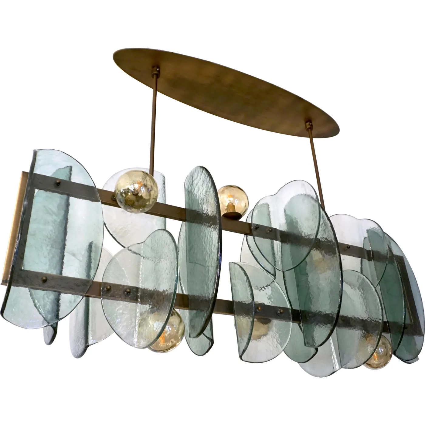 This contemporary chandelier features a distinctive modern geometric design, entirely handmade in Italy. Its molded, textured Murano glass elements have an expressive, organic rounded shape in a stunning green-blue aquamarine hue reminiscent of the Fontana Arte style. The glass showcases two tones—one lighter and one darker—adding depth and sophistication. Arranged in an asymmetrical composition reminiscent of a modern abstract painting, these elements are mounted on a handmade rectangular brass structure with a stylish golden bronze finish and an oval canopy. The fixture includes 6 lights enclosed in amber-smoked blown textured Murano glass globes. Fully customizable in glass colors and finishes, this exclusive design is available through Cosulich Interiors & Antiques. Body height: 23 inches.