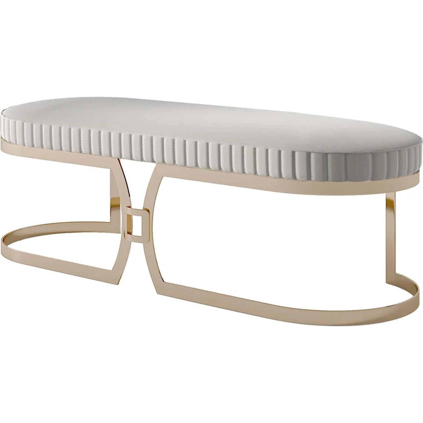 A distinguished member of the Montecarlo collection, this bench showcases a golden-finished metal base that beautifully complements the cream econubuck upholstery. The padded seating is adorned with vertical stitchings, adding a distinctive touch to this piece. For personalized adjustments, please consult our Concierge for a variety of customization options.