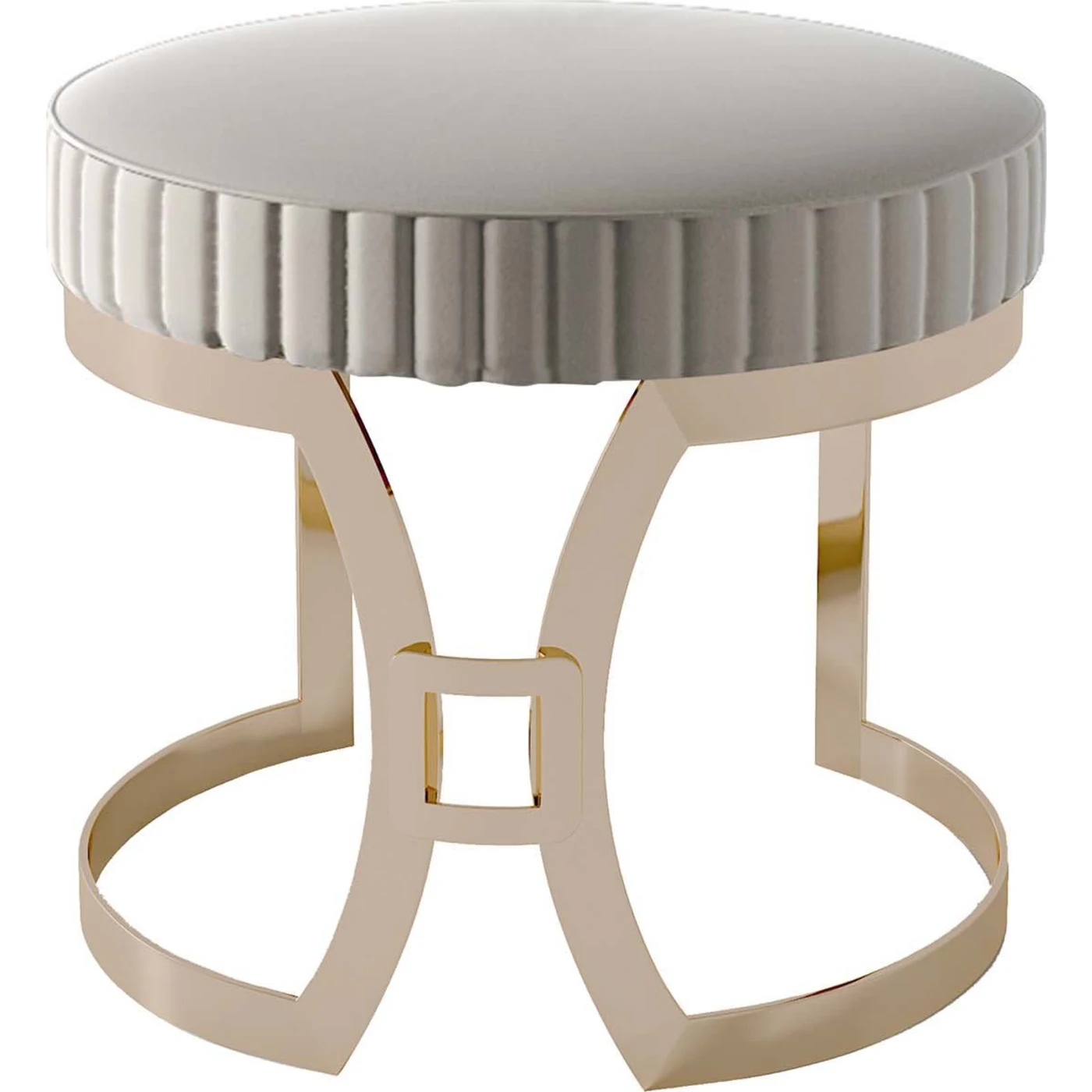 This padded stool features a golden-finished metal base paired with a cream econubuck padded seat, creating a harmonious blend of luxury and comfort. Vertical stitchings adorn the seat, adding an extra touch of elegance to this distinctive piece. For personalized customization options, please reach out to our Concierge.