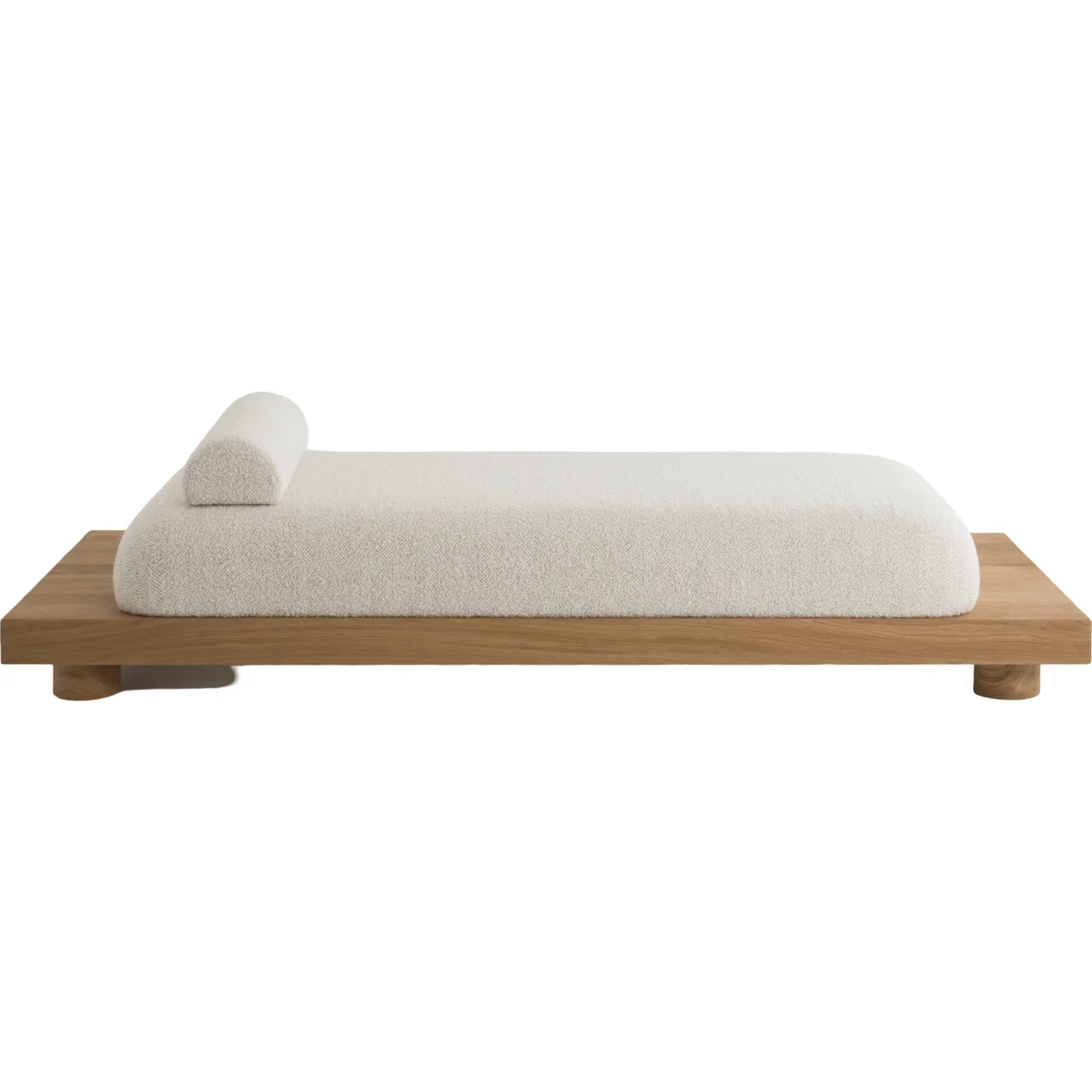 The NOMAD collection fosters a conversation between the inspiration of wabi-sabi and the elegance of French design. The rugged look of brushed wood contrasts with the soft curves of the upholstery; the simple lines merge with rounded shapes, achieving a balanced and refined harmony. The solid wood planking gives the NOMAD sofa a unique aesthetic and practical purpose by giving it the impression of floating.The upper borders on both sides give the furniture a personalized appearance while enabling the organization and presentation of goods while still offering sitting.