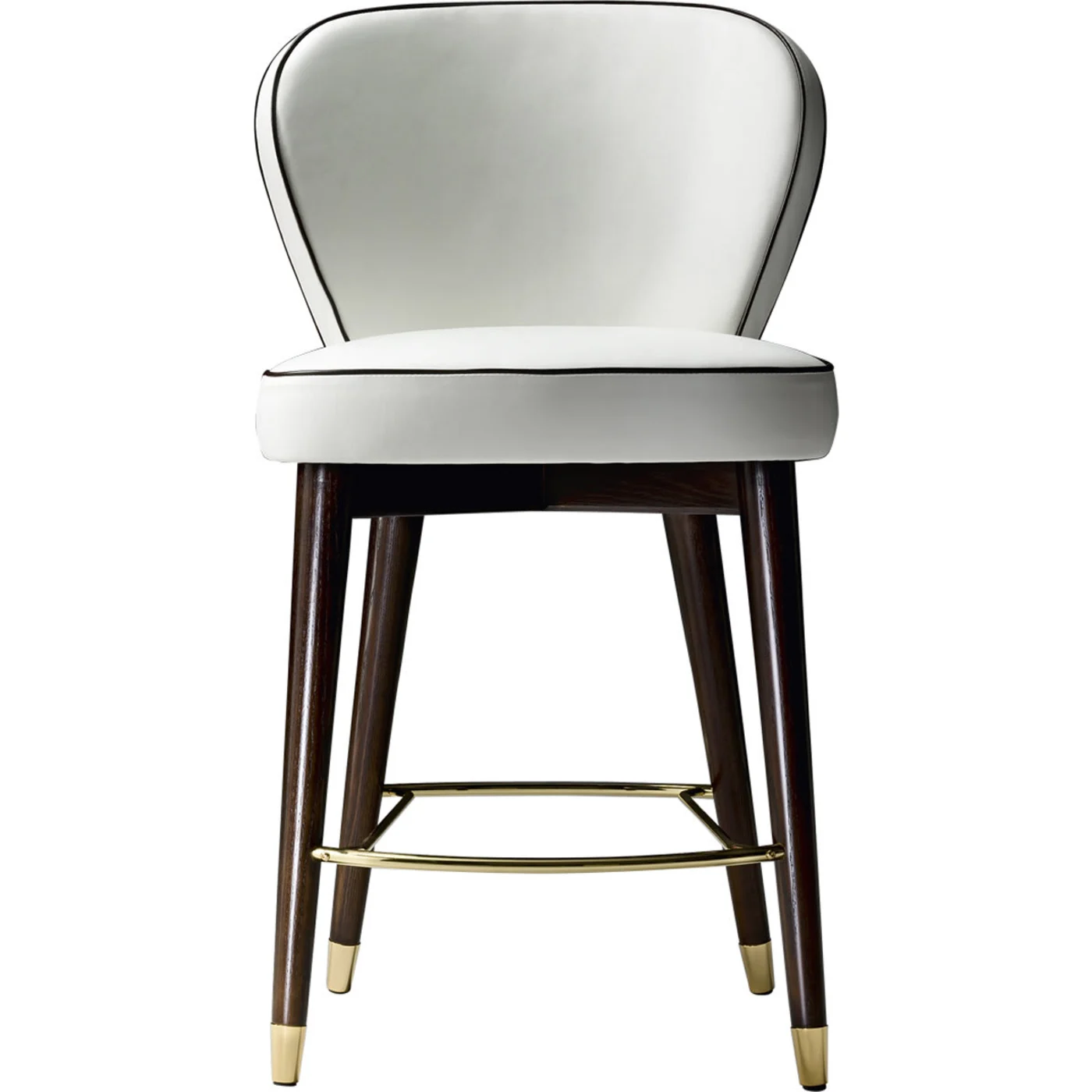 Crafted from beechwood, this elegant stool features padding made of expanded polyurethane, providing comfortable seating. It is upholstered in fabric with dark accents tracing its perimeter, adding a touch of sophistication. The stool stands on solid wood legs with gold-finished metal glides, combining stability with a touch of luxury.
