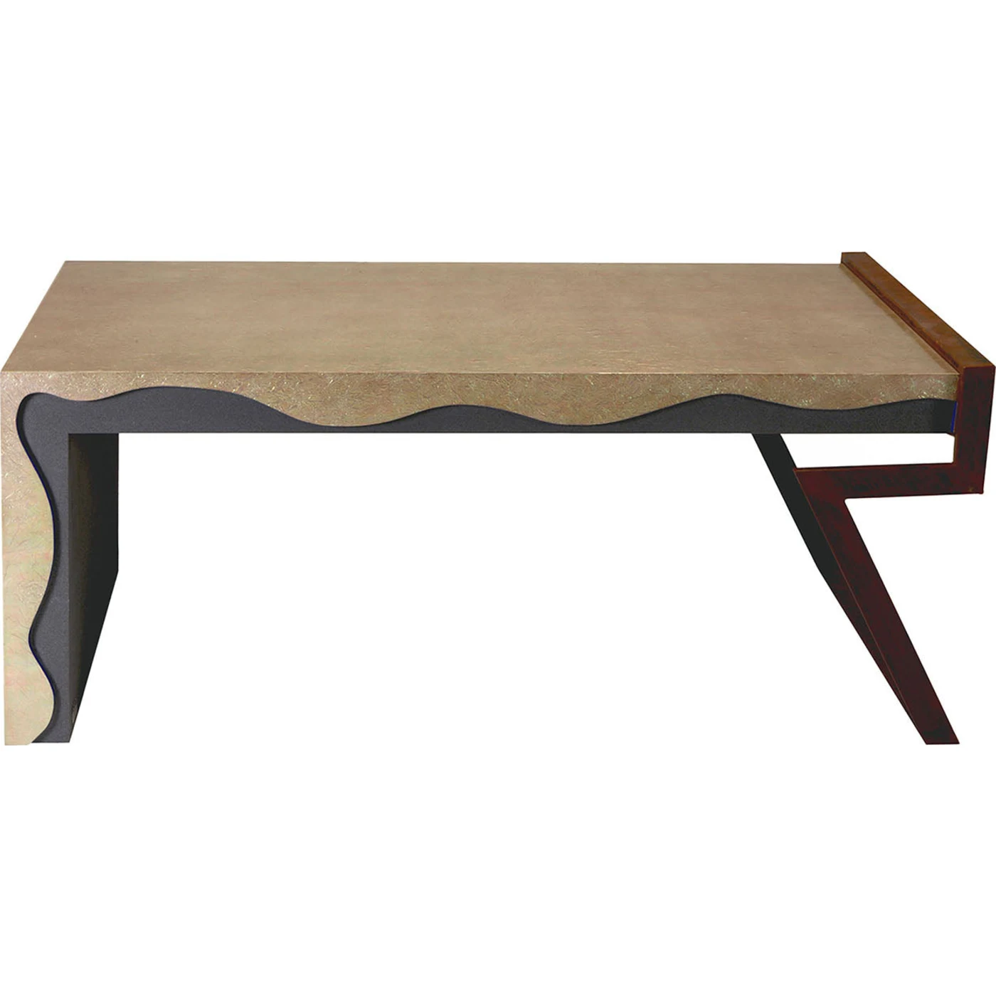 This desk is an artistic item that celebrates waves, even when they are far away, in urban private studies. It is striking due to its asymmetrical shape. A compelling wavy profile extends up to the opposite side, where the dynamic-cut metal leg displays a warm, Corten-effect look, and a unique iridescent finish called "Medusa" accentuates the top and one of its sides.