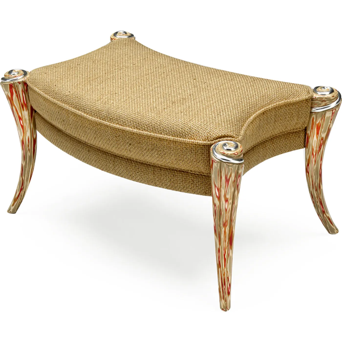 This rectangular footstool is unique due to its exquisite craftsmanship, and it will definitely stand out in any room. With silver accents on the coiled tops, this footrest features carved wooden legs with a red and beige finish. The beige cloth is used to cover the two-tiered cushions.