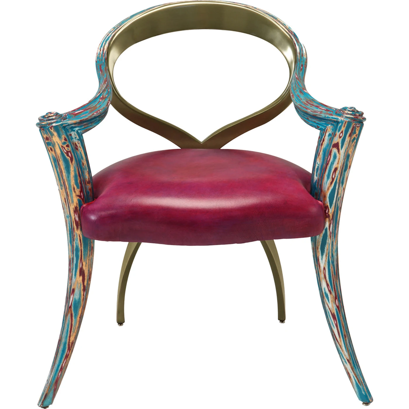 The Opus Metallica Chair's distinctively contemporary design sets it apart. Its backrest and back legs have a Champgold finish, which contains more than 95% metal, while its armrests and front legs are carved from real wood and feature an inventive Crazy Glass surface. Including a bright leather seat.