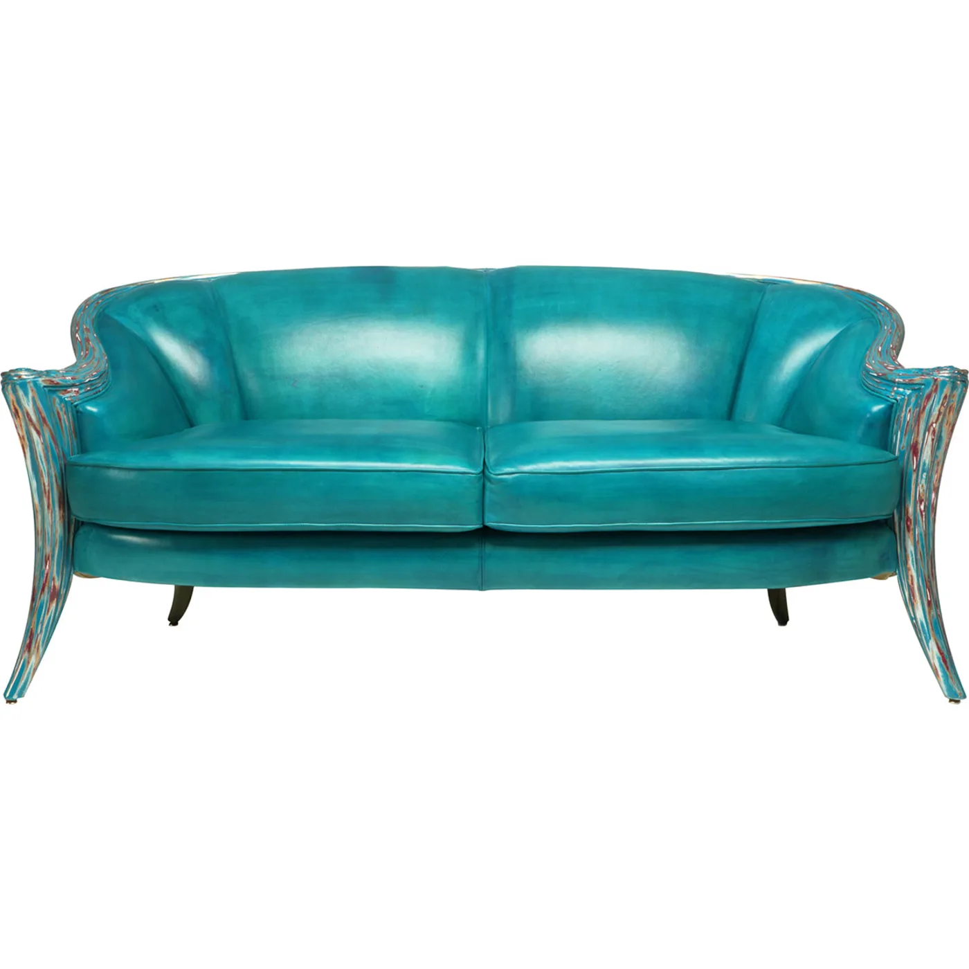 The Opus Futura collection, created by Carlo Rampazzi, which includes this gorgeous sofa, is a variety of eclectic seating options that will look great in a modern or contemporary setting. This two-seater in particular has a timber frame that has been finished with Champgold metal, a varnish that contains almost 95% metal. A unique, dynamic impression is created by the Crazy Glass coating applied to the carved front legs, which also serve as the frame for the curved back. The leather upholstery has a chic turquoise-blue color scheme.