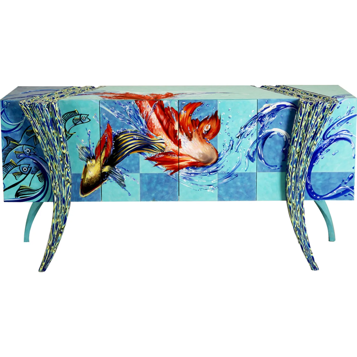 This sideboard, from the Opus Futura Collection, is a focal point for a modern or eclectic space. Its lacquered "Crazy Glass" finish gives the impression of a Venetian "murrina." Two wooden legs with a kaleidoscopic design in green, yellow, and blue that wraps in a sinuous arc around the top support the two-door wooden frame. With a school of fish in the left corner and two red fish swimming in the softly rippling water in the middle, the top is hand-decorated with a summer-inspired design. Colors and design can be modified upon request.