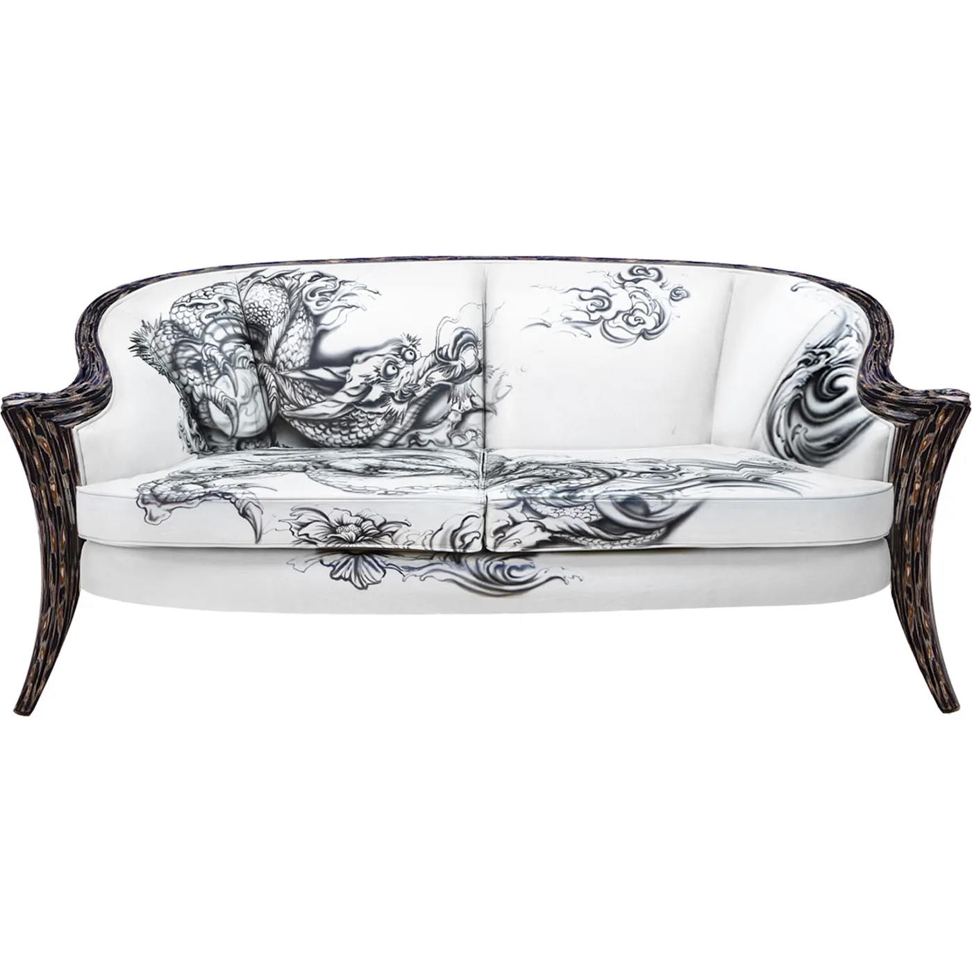 This unique two-seat sofa, designed by Carlo Rampazzi, from the Opus Futura line is a gorgeous addition to a modern or eclectic house. It will bring a distinctive touch of charm to a living room, bedroom, or study. Plaster ornamentation, Crazy Glass finish, and gold accents give the wooden frame of the curving backrest and carved legs a textured appearance. The cushions are covered in a white leather cover that was hand-painted with a gorgeous black design that resembles a gothic-inspired tattoo.