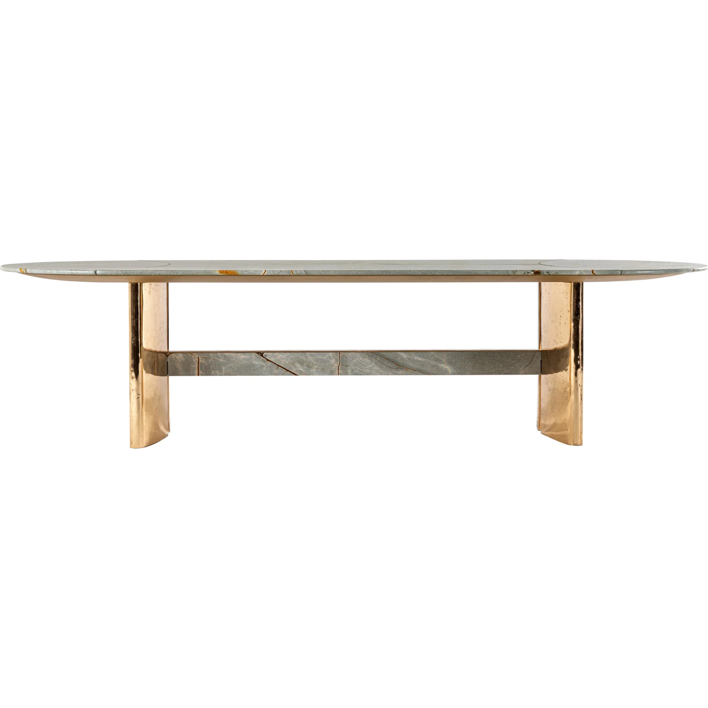 The Spinnaker dining table draws inspiration from the elegance and lightness of sails unfurled to the wind on sailing boats. Its marble top can be chosen as a single, seamless piece or divided into four curved sections that follow the structural base, which features two arches reminiscent of 1930s architecture. The base is crafted from melted bronze, cast into molds made from special sand. The Arabescato Orobico marble complements the bronze metal base, balancing its color tones beautifully.
