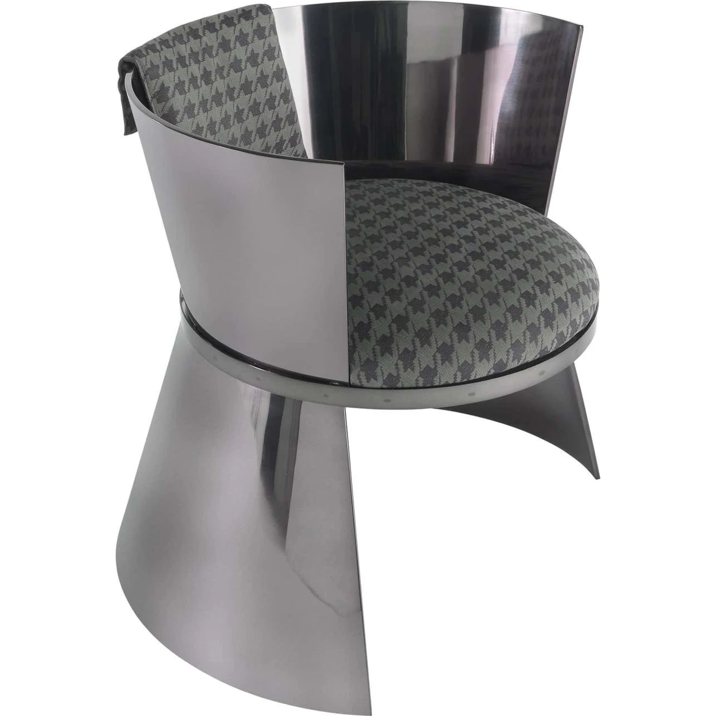 The Pearl armchair stands out with its distinctive hourglass shape, featuring alternating elements in a glossy and chrome-plated London smoke grey finish. Its houndstooth fabric seat cover lends a masculine touch, perfect for urban and metropolitan interiors. Constructed with an aluminum frame finished in Black Chrome, the Pearl armchair includes a seat crafted from poplar multilayer wood, encircled by an outer aluminum ring. Both the seat and compact backrest are padded with foam, while the upholstery in leather (cat. B Printed Nabuk L.15.02 Pied de Poule Taupe) adds a refined, textured appeal.