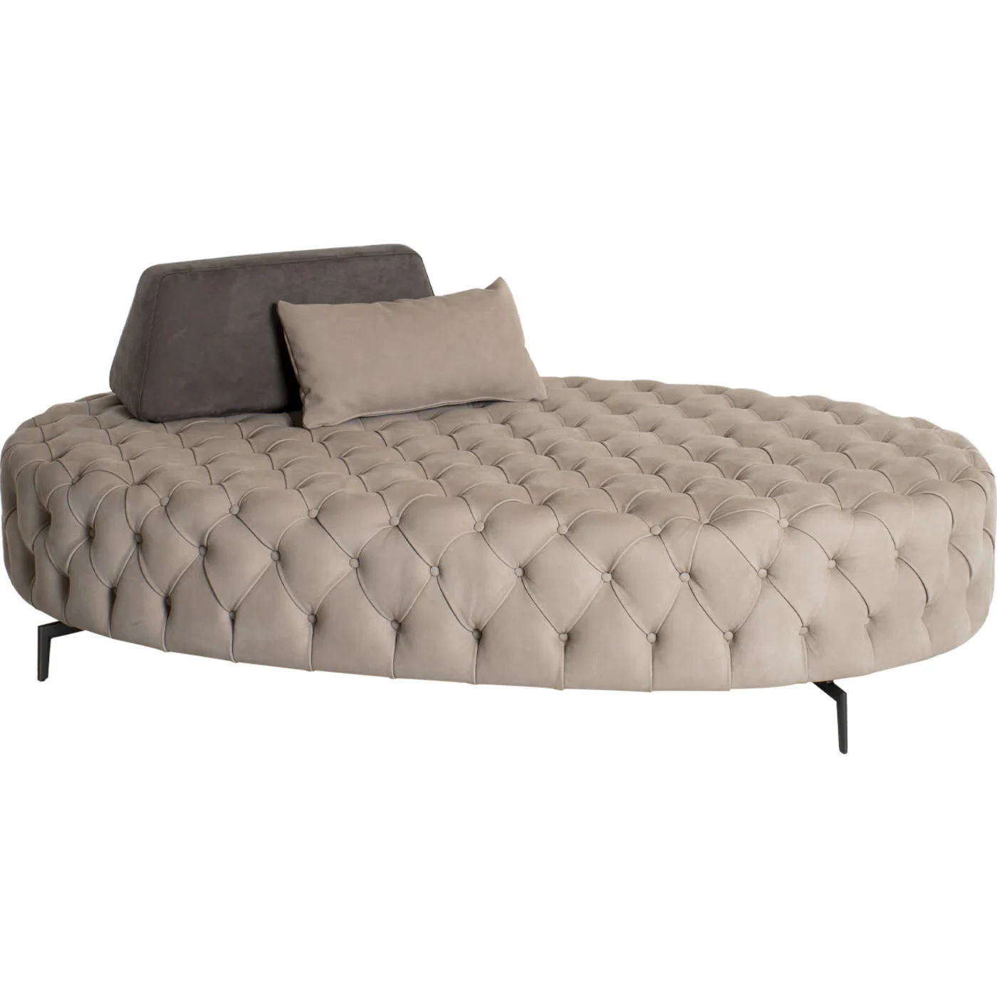 Stand out with the unique 100% Italian Pharrel pouf, distinguished by traditional capitonnè manufacturing. This beige oval furnishing accessory boasts a padded wooden frame and black-lacquered metal feet. Ideal for your moments of relaxation, the Pharrel pouf is fully customizable, offering a range of sizes and upholstery materials to suit your preferences and enhance the style of your space.