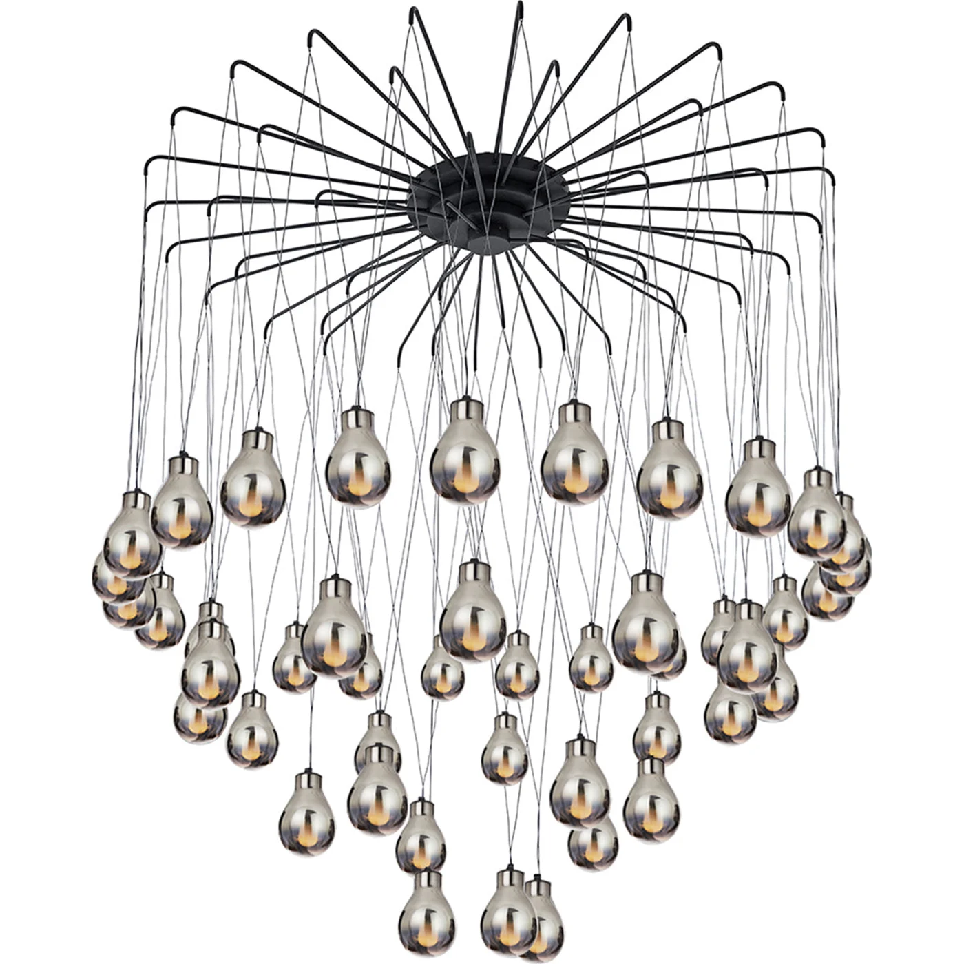 With its stunning cascade of shimmering glass bulbs highlighted in a polished and mirrored smoky finish, this beautiful chandelier will be a stunning focal point in a contemporary setting. Featuring 45 glass bulbs in a smoky polished mirror finish, this chandelier is minimalist and stylish. The bulbs are strung on V-shaped threads that are secured to a visually striking spider-shaped ceiling rose made of matte black metal. Please contact the concierge for information on customization options.
