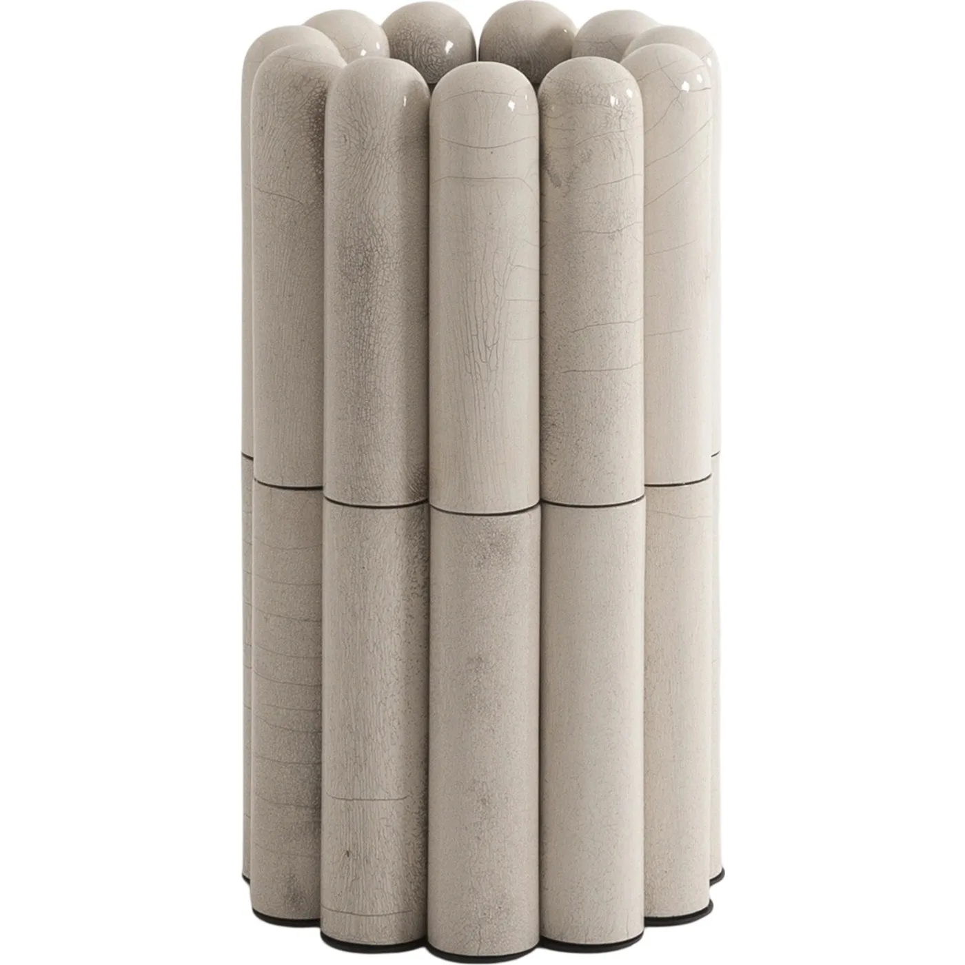 The items in the Raku-Yaki collection are bold and adventurous. Raku is an old Japanese ceramic technique used to create the tiles that embellish the furniture and lighting fittings. Thermal shock causes the glazing to shatter, exposing faint black lines that form haphazard patterns that resemble a skyline. Each piece is one-of-a-kind thanks to this process, and the strength and enchantment of handmade craftsmanship are displayed in wall-mounted pieces, lighting, buffets, tables, and bar cabinets. Both the material's atmosphere and its design convey a subtle elegance.