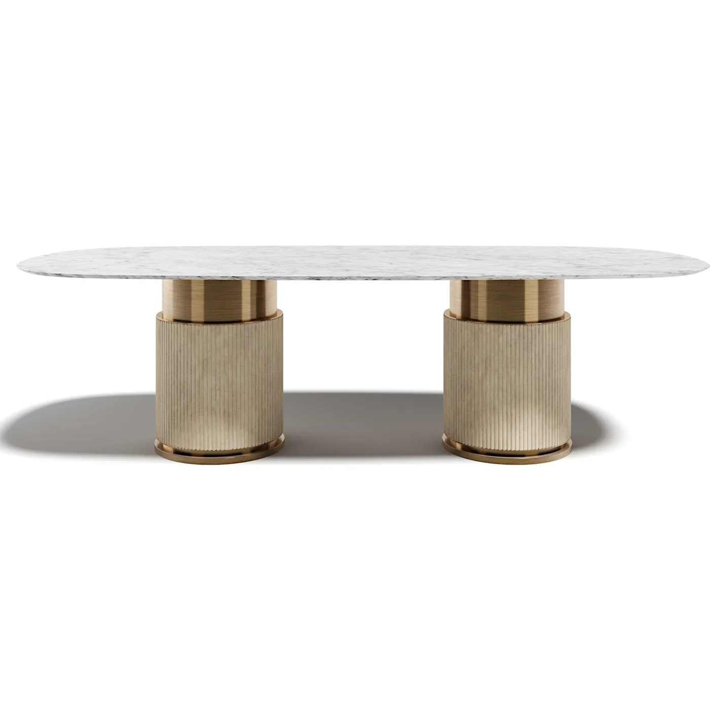 Rock Oval presents an elegant oval wooden table featuring a frame upholstered in leather or fabric, complemented by a wooden top for a sophisticated look. Its wooden frame is accented by metal profiles and details, adding a touch of modernity to its design. Additionally, the base is upholstered with leather, enhancing both its aesthetic appeal and comfort.