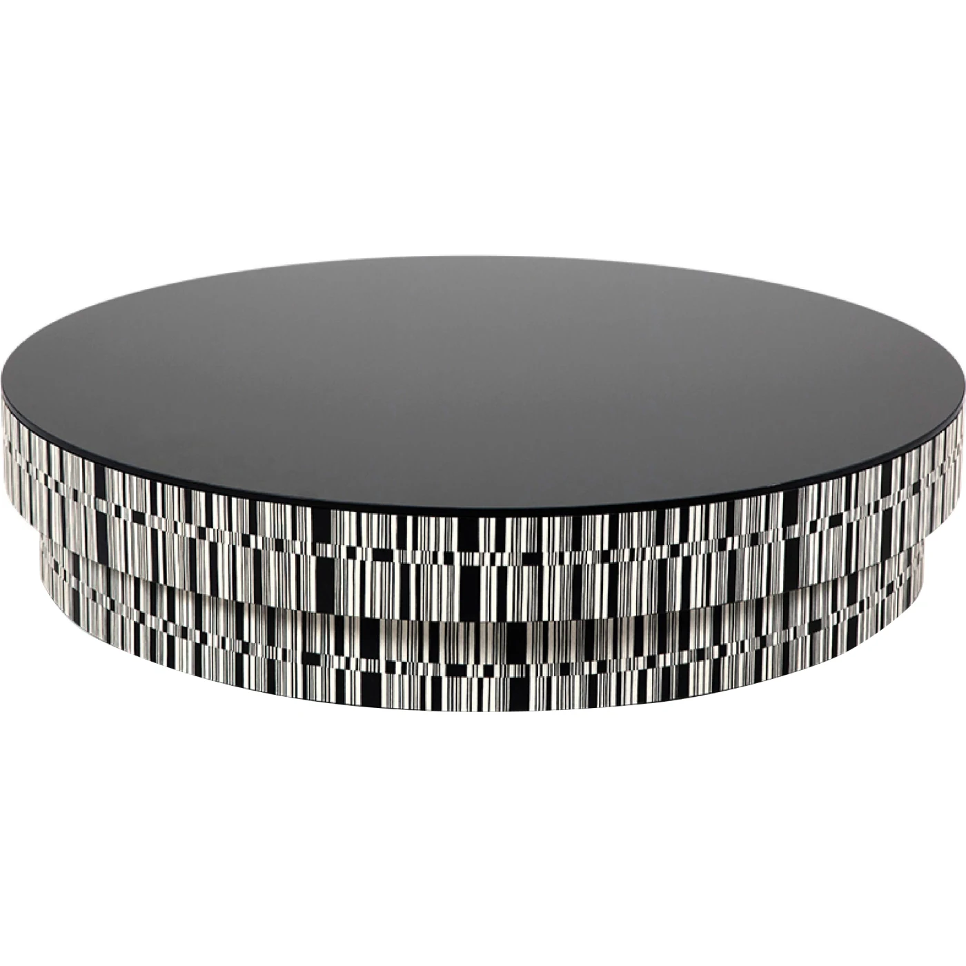 The Enigma coffee table collection features diverse shapes and proportions, showcasing alternating white and black wood veneers in an irregular pattern. The Matrix finish of the Enigma coffee table is available in both matte and glossy versions, complemented by a black glass top that completes the overall structure.