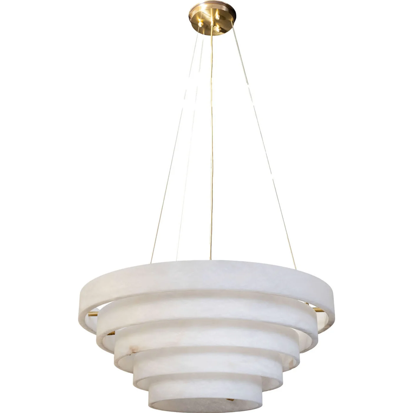 This Stylish suspension lamp showcases five natural alabaster rings in varying sizes from 30 cm to 70 cm. Each ring is uniquely characterized by veining that gracefully transitions from white to brown giving every piece its own distinct charm. The organic patterns of the stone ensure that this light fixture is both striking and one-of-a-kind, adding natural beauty and sophistication to any space.