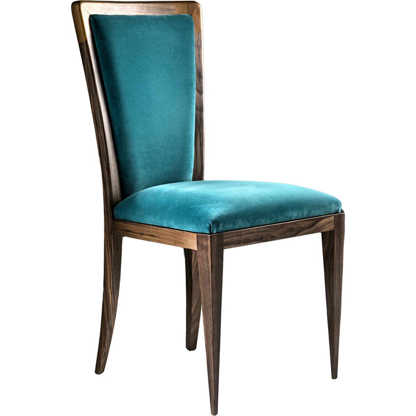 Exuding confident glamour, this lounge chair is a testament to welcoming design. Crafted with a sturdy Canaletto walnut structure supported by four tapered, slanted feet, it provides a solid foundation for the imposing seat and backrest. Fully upholstered in soft turquoise fabric adorned with vertical stitching accents, it exudes elegance. The plush cushion covering the seat ensures excellent comfort, inviting relaxation in style.