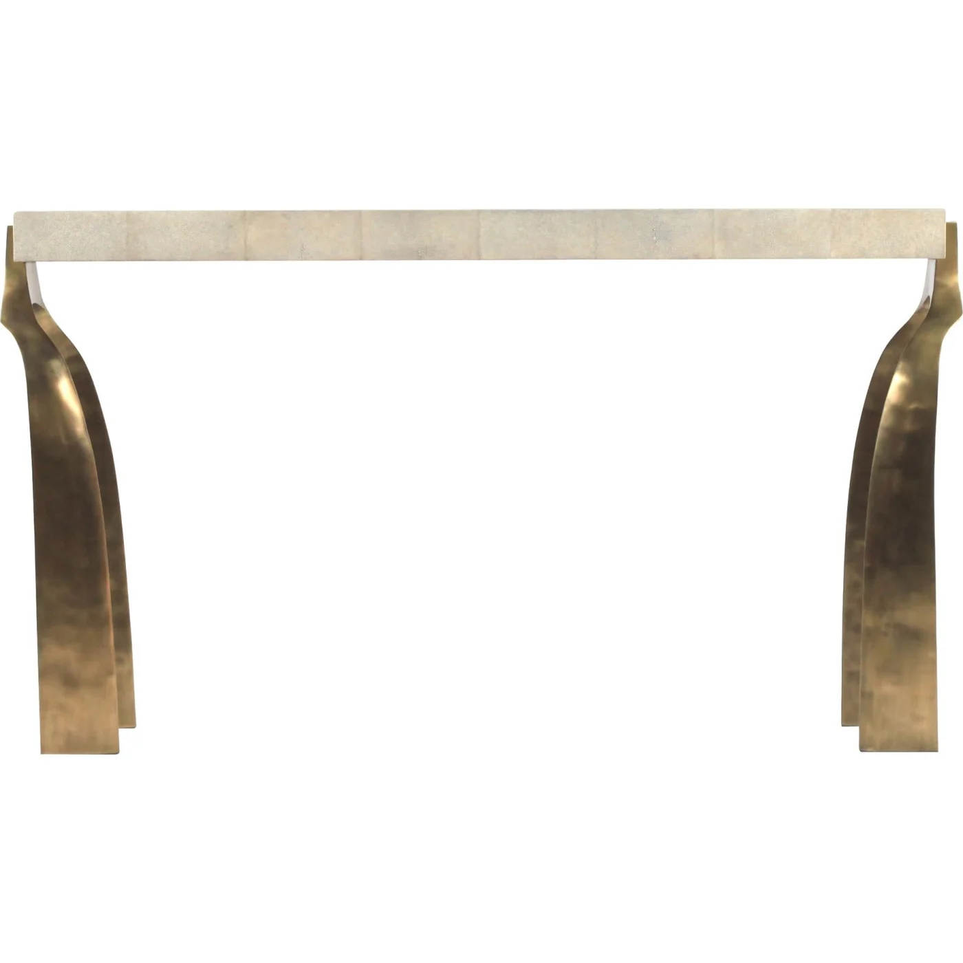 The Galaxy Console Table is a striking and organic piece, defined by its unique design. The cream shagreen inlaid top rests on a pair of ethereal, sculptural bronze-patina brass legs, creating a bold visual statement. This design is also available in a writing desk version (see image at the end of the slide). Designed by Kifu Augousti, daughter of Ria and Yiouri Augousti, the shagreen finish is authentic, hand-dyed by artisans, and referred to by the designer as "antique natural shagreen."