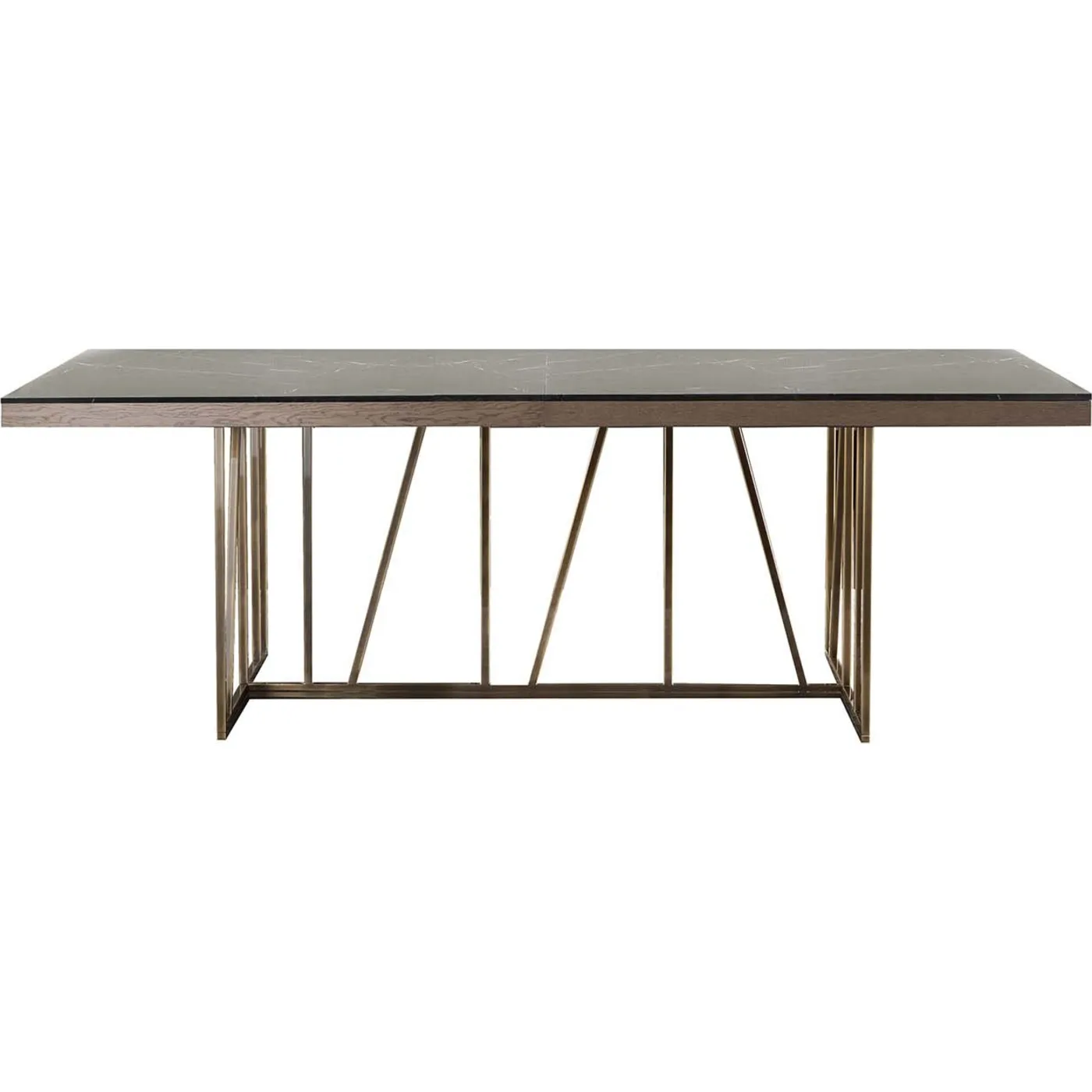 Resting on a burnished brass base with a striking combination of diagonal and straight lines, the 2 cm-thick polished gray Saint Laurent marble top adds a touch of luxury. This stunning table is also offered in other finishes and in an extendable version with a wooden top or different marble options. For pricing details, please contact the Concierge.