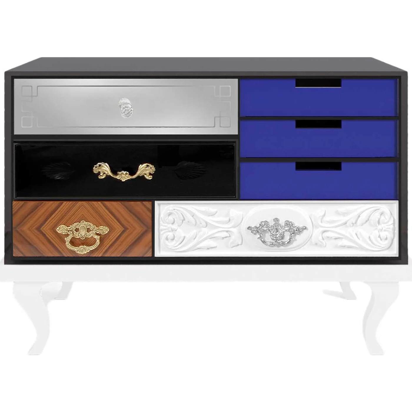 The Soho Bedside Table is another item in the Soho Collection. includes high-gloss blue or pink lacquer, white lacquer, diamond-matched rosewood veneer, etched details, and hand-carved relief patterns on a set of mirror-and-black-glass-finished wood drawers. Housed in a high-gloss bronze glass box, the drawers are adorned with handcrafted brass pulls, some of which are chrome-plated, and cut glass knobs.