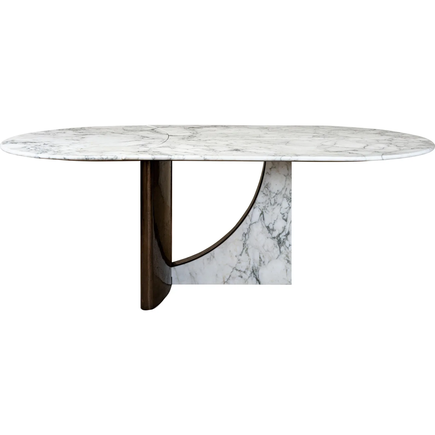 The Spinnaker dining table is inspired by the elegance and lightness of sails on boats unfurled to catch the wind during sailing. Its marble top can be selected as a single, unified piece or divided into three curved sections that align with the structural base featuring two arches reminiscent of 1930s architectural geometry. The base is crafted from melted brass, formed by casting liquid metal into molds made from special sand.