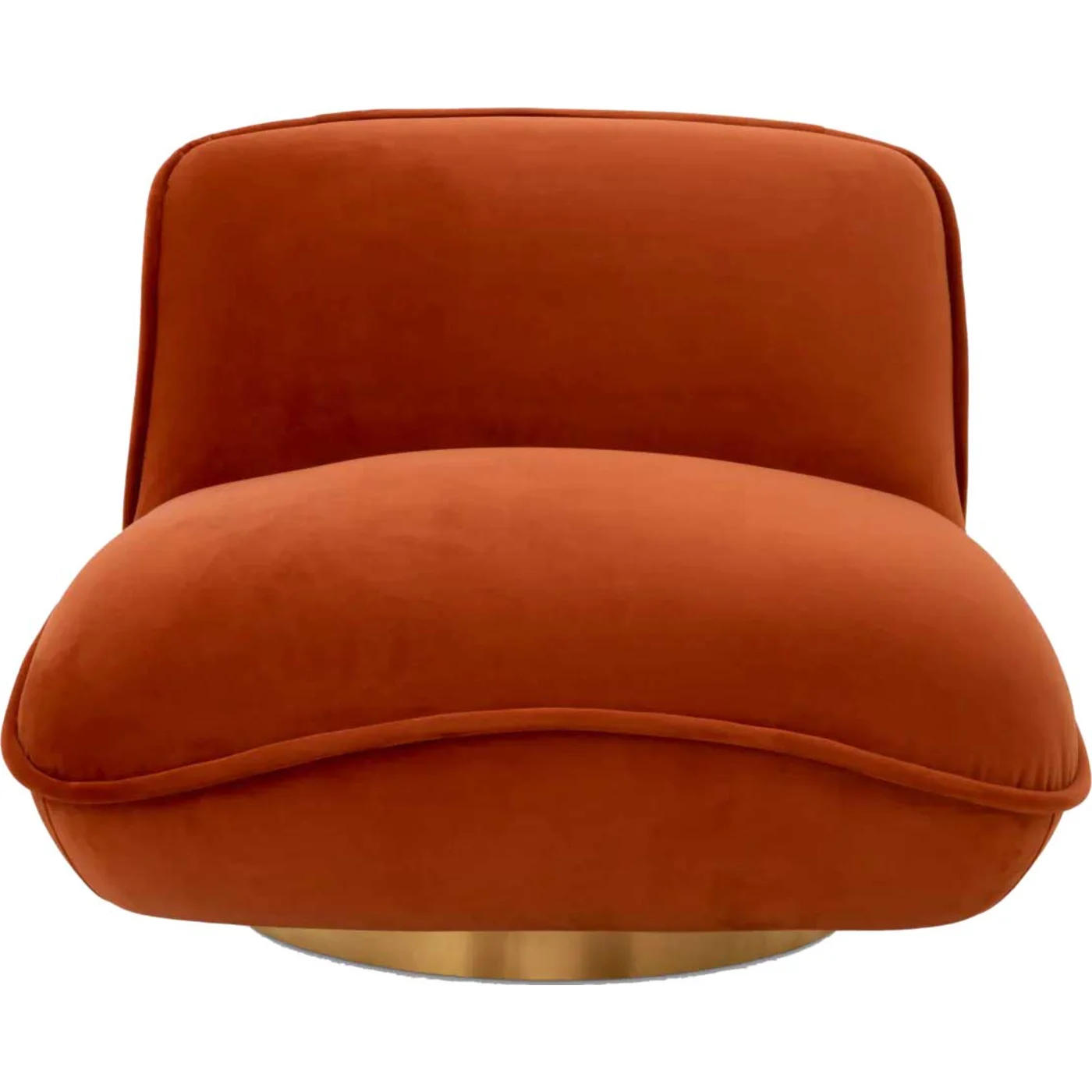 Named for its purpose, Chair Relax provides an ideal setting for afternoon relaxation. Its design, resembling two pillows at right angles, blends aesthetics with comfort. Upholstered in Savona orange velvet with piping details and supported by a brushed brass swivel base, this accent chair promises to command attention in any living room.