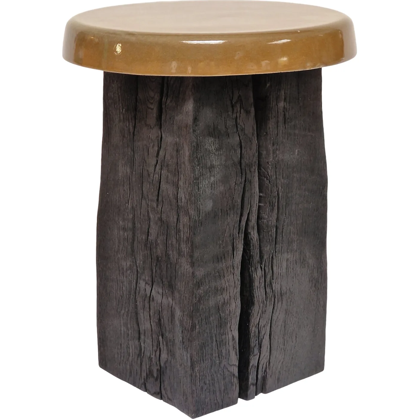 A distinctive side table with a ceramic top and a blackened solid wood sculpture. This piece's design accentuates the wood's organic beauty and its asymmetrical shapes.Its sculptured presence lends any space a refined personality.