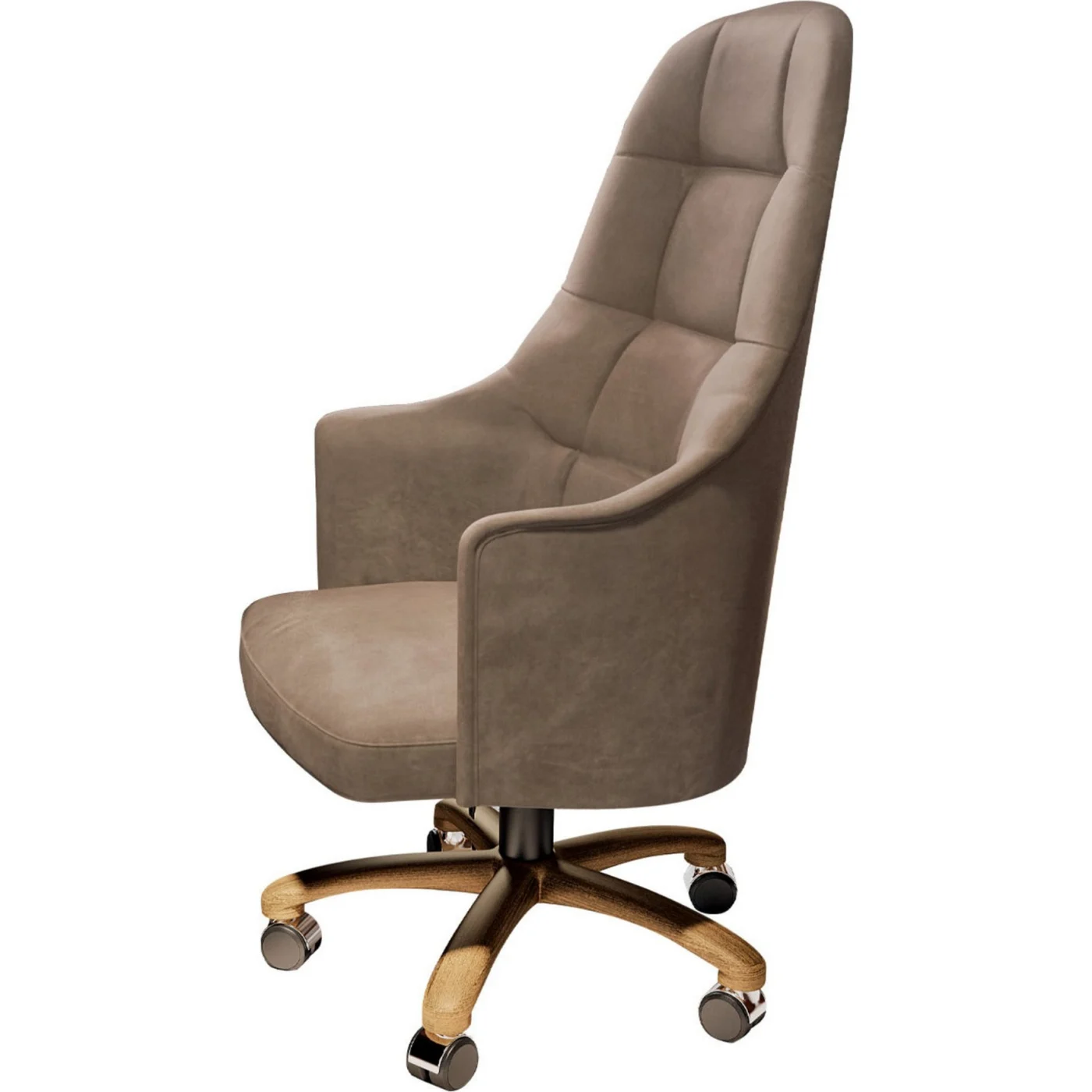 This sophisticated swivel armchair commands attention in a luxurious, contemporary interior with its understated yet bold character. The natural-finished wooden base exhibits five spokes, while the enveloping plywood frame is generously cushioned for optimum comfort. Taupe techno-nubuck upholstery adorns both the seat and the extra-tall, sloping back, which is adorned with a quilted design, adding an extra touch of elegance.