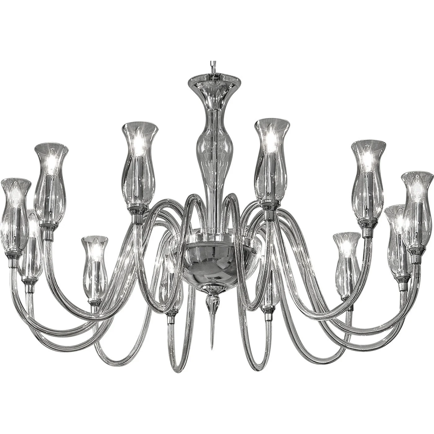 Encased entirely in crystal blown Murano glass, this chandelier epitomizes classic elegance with a sinuous design that enhances both traditional and contemporary interior decors. Featuring 12 arms extending gracefully from the chrome-finished bottom bowl in a bold curve, each arm holds a sinuous glass diffuser housing the candle tubes with E14 max 42W light bulbs, creating breathtaking light effects. Ideal for large foyers, the Teodoro Chandelier offers various configurations, colors, and is available with a gold finish upon request.