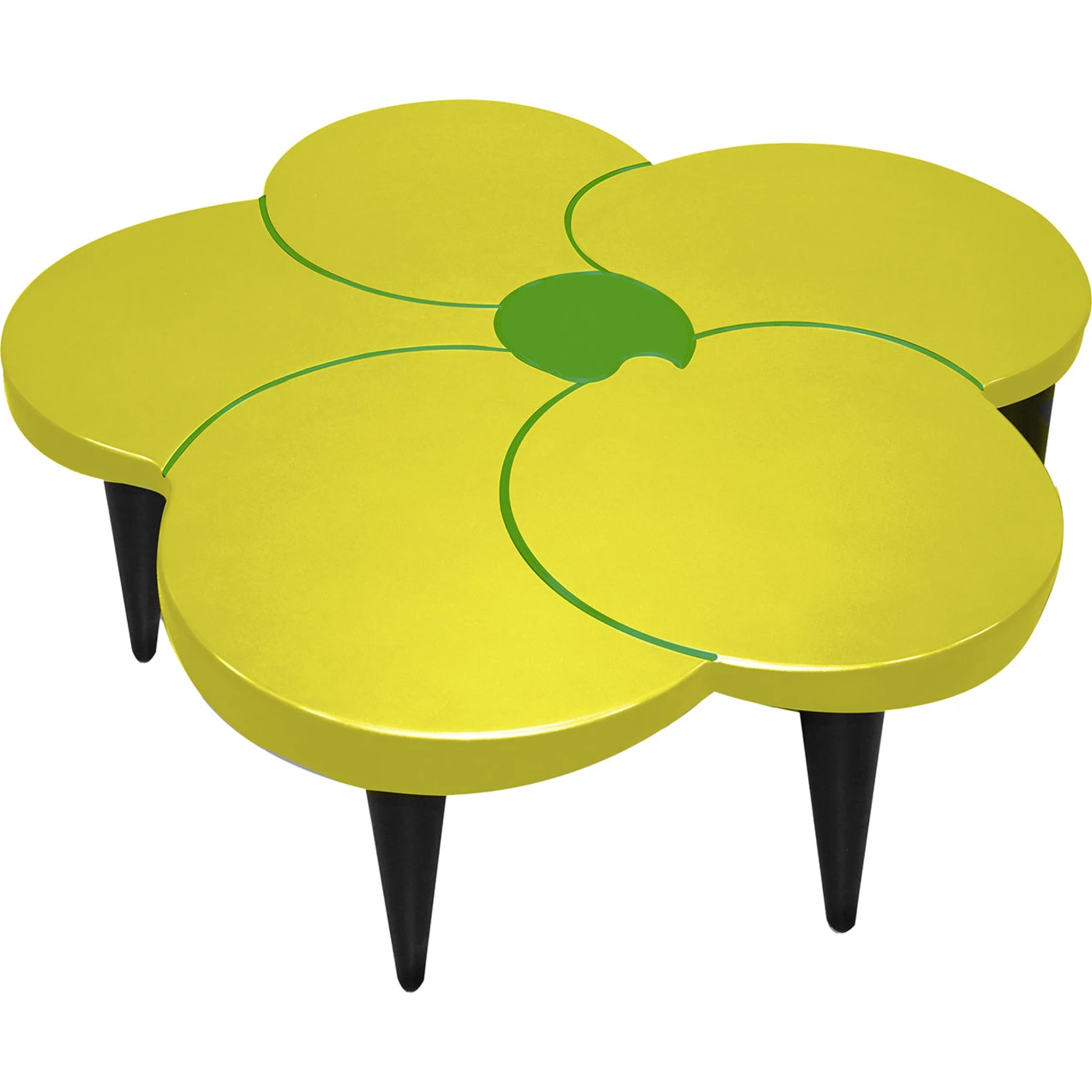 This flower-shaped wooden coffee table effortlessly draws attention with its charming and vivid design that draws inspiration from nature. It will also bring a whimsical touch to modern or contemporary decor. The quirky flower top, which features a bright yellow lacquer with contrasting elements, is supported by black-lacquered twisted feet. To specify whether the versions are matte- or glossy-finished, please get in touch with the concierge.
