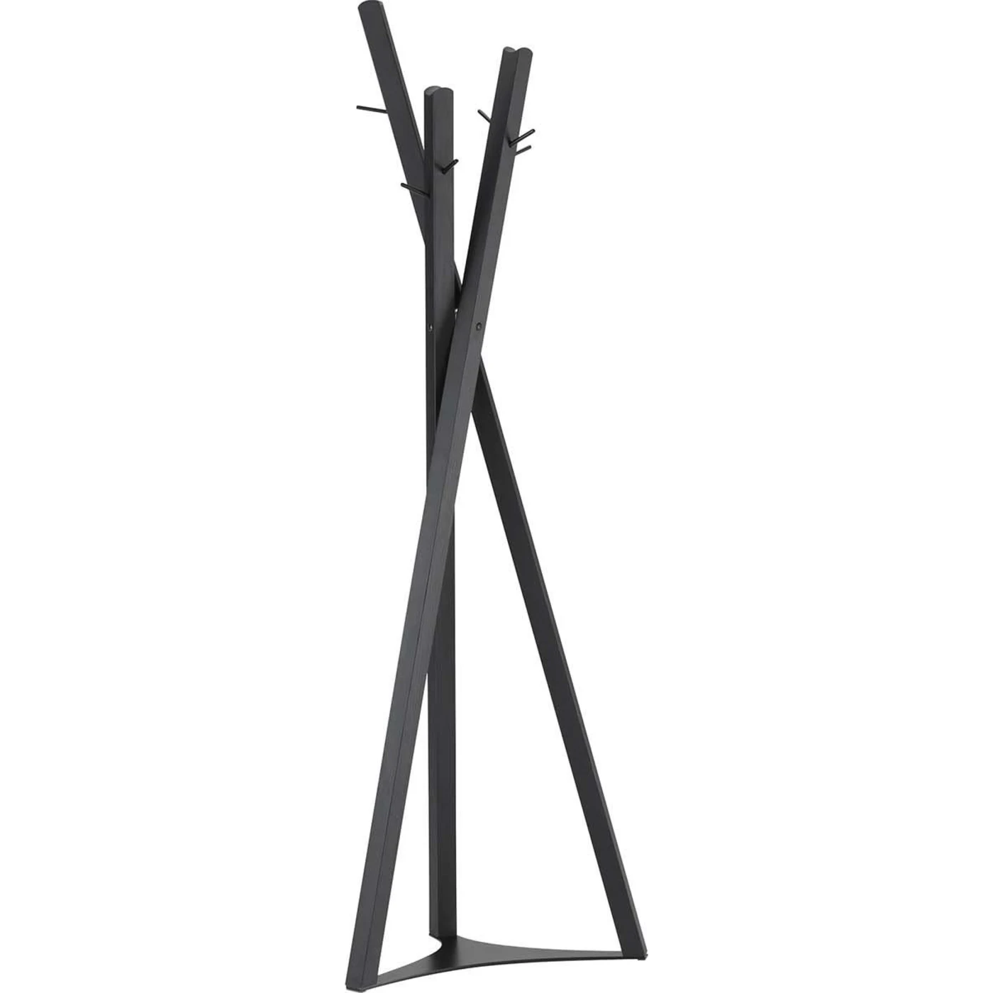 This coat hanger, a splendid sculptural work of art by architect and designer Massimo Broglio, draws inspiration from the legs of his Niels side table. It rests on a black metal base and features a striking silhouette composed of three black ash wood elements of varying sizes and angles, enriched with metal pegs.