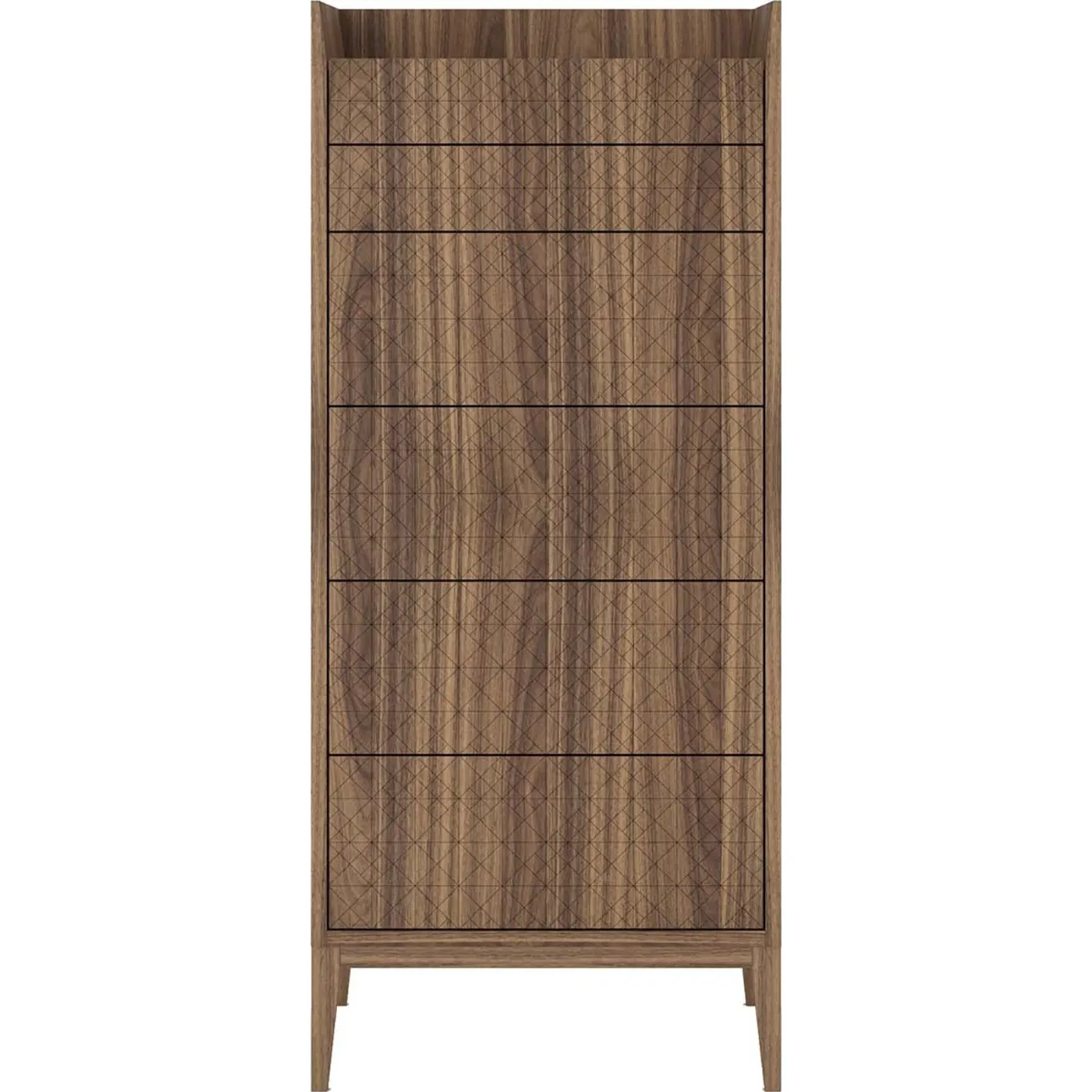 Featuring a diamond pattern inspired by the ancient Japanese "kumiko" woodworking technique, this walnut-veneered tall dresser from the Trame Collection enhances the modern bedroom with its clean, geometric design. Set on a low base with four straight legs (20 cm high), the dresser includes six soft-close drawers, including two short ones on top. Each drawer is equipped with BlueMotion slides and a 15 mm plywood interior. The intricate computerized engraving is achieved through an innovative Computer Numerical Control (CNC) system, following a digital print on the wood surface.