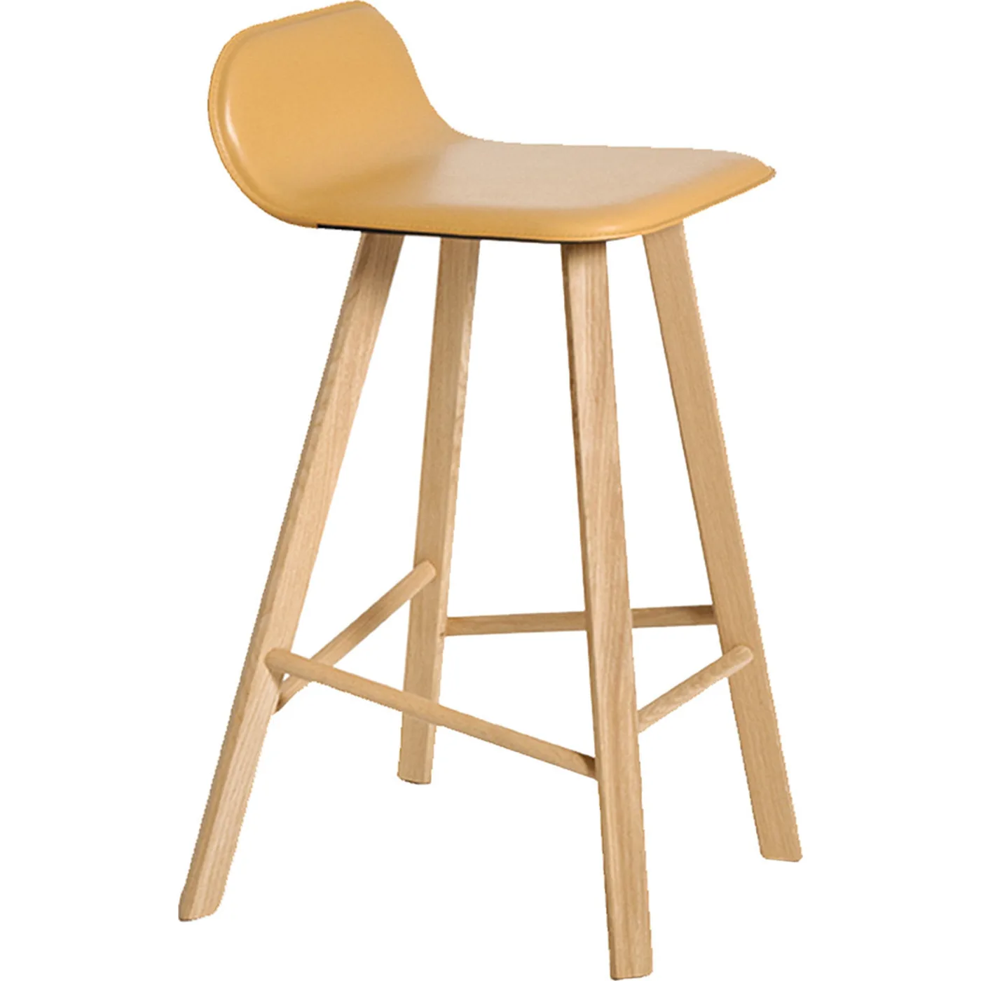 The seat is made from a plywood shell with an oak veneer and a coffee-stained open pore finish. It is available in custom colors and comes in two seat heights: 67 cm for kitchen counters and 77 cm for bar tables. For customization options, please contact our Concierge.